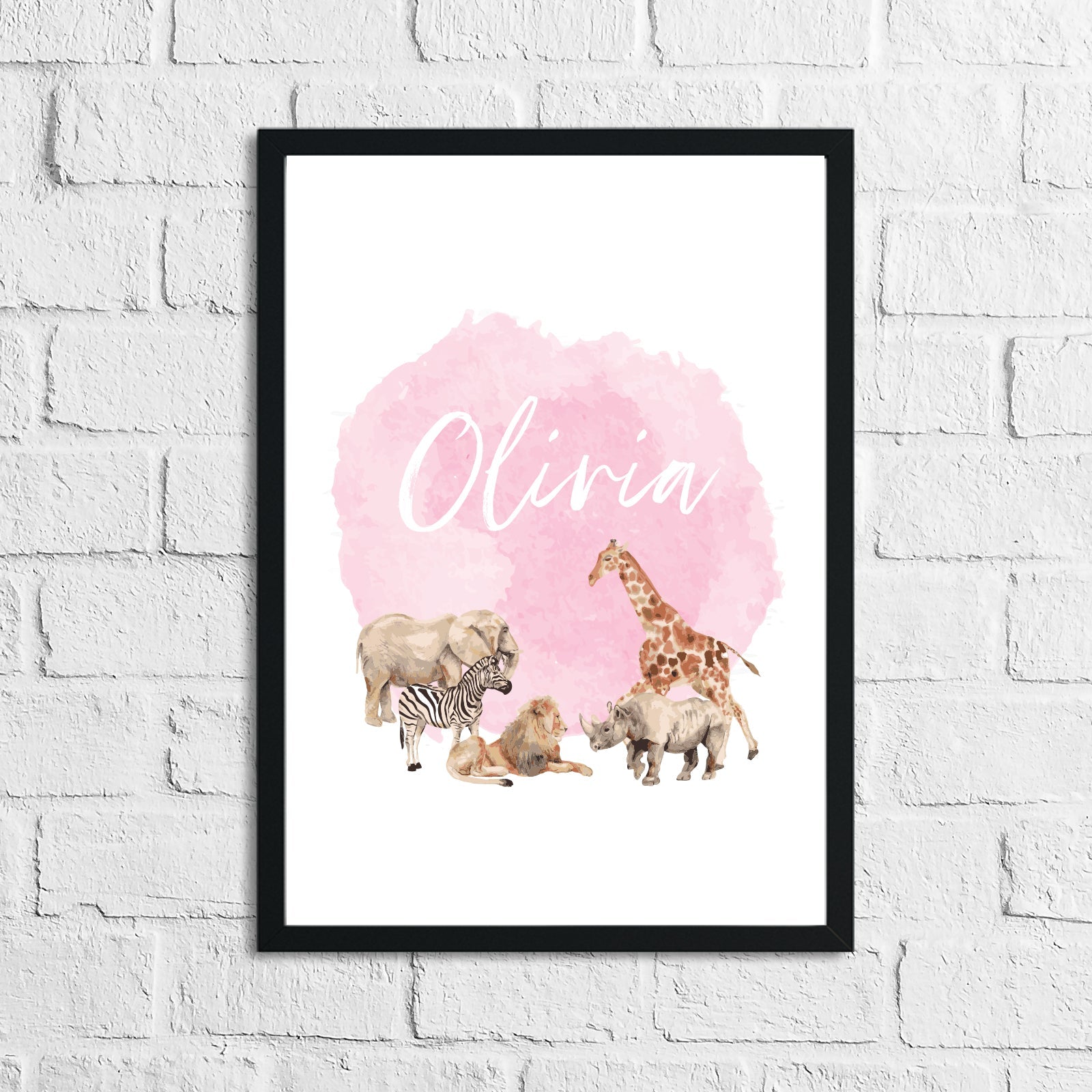 Personalised Zoo Animals Name Pink Children's Room Wall Decor Print