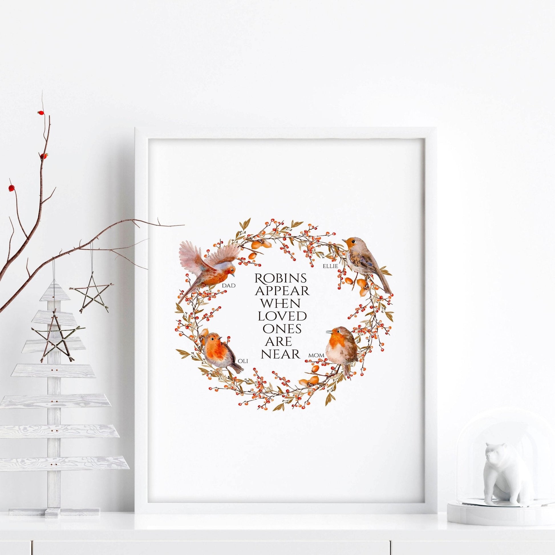 Celebrate your family's joy and togetherness this Christmas with our Personalized family tree wall art. This enchanting print captures the essence of love and unity, as robins are known to appear when loved ones are near.