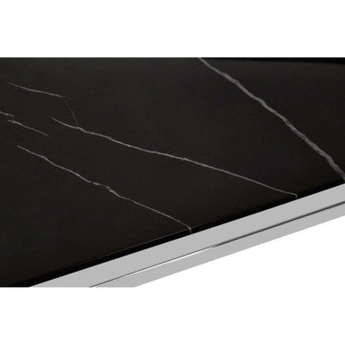 A slab of sleek black marble crowns the top while a matching marble base anchors the design, lending natural depth and a refined, gallery like mood. Between these stone elements sits a polished silver stainless steel frame with crisp lines that keep the silhouette light and modern.