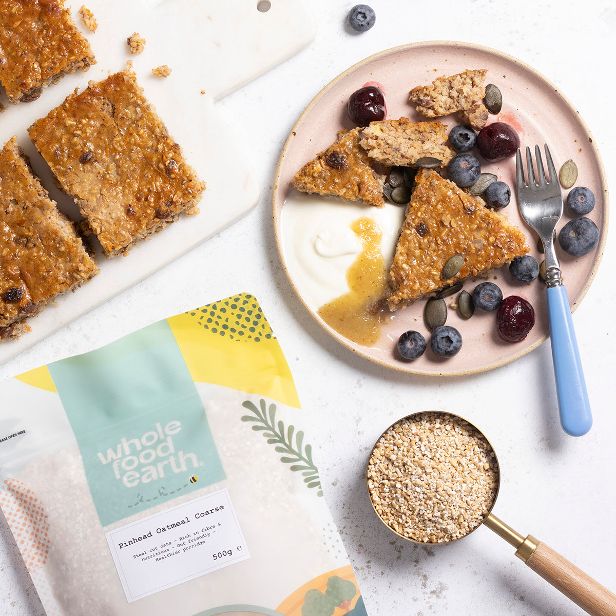 Coarse oatmeal (also known as Pinhead oats) are basically diced wholegrain oats. They are especially suited for making porridge, oaty grits, flapjacks and veggie burgers and should always be used over regular oats for such purposes.