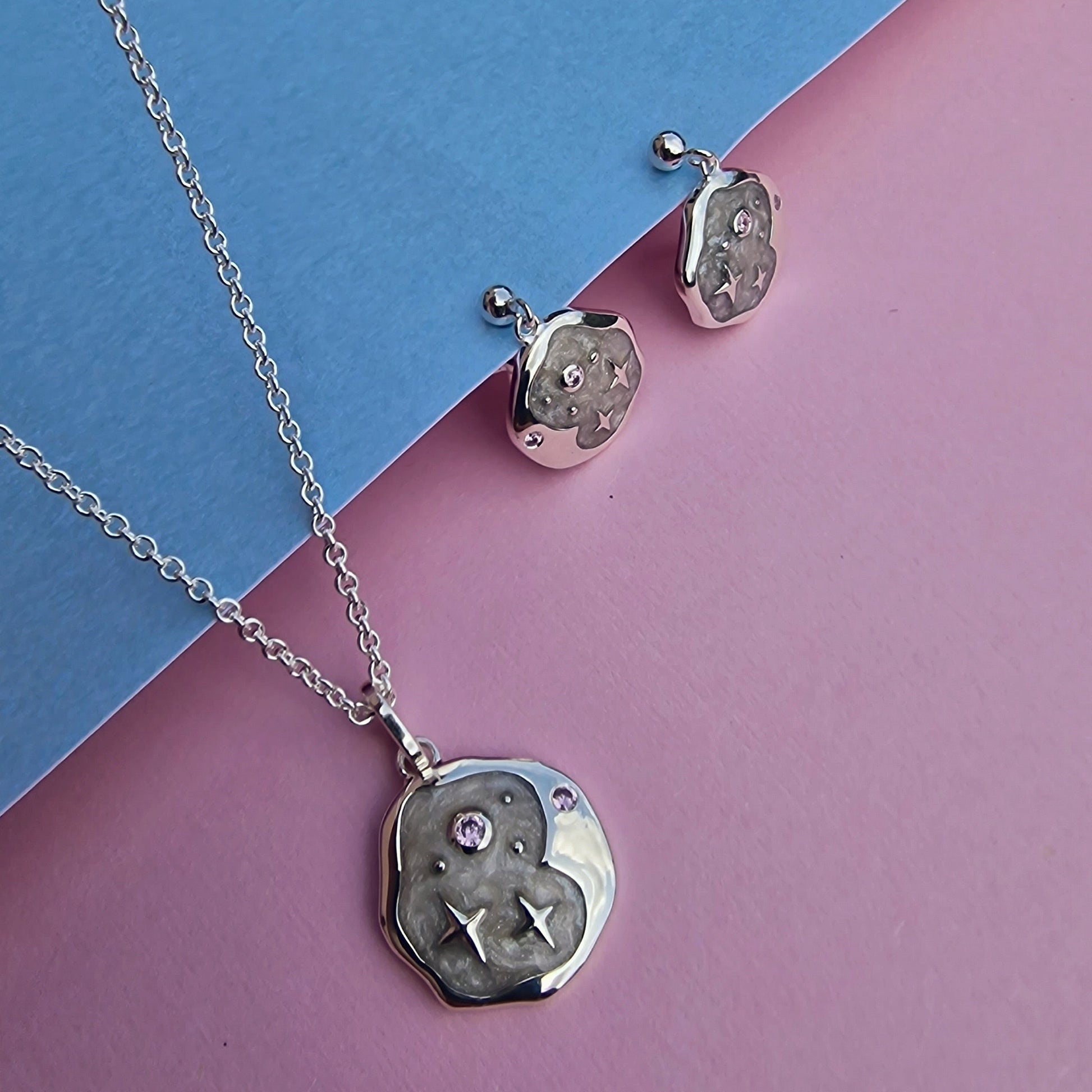 set with a pink opal in the eye of the moon and distant planet with pearl coloured enamel night sky.