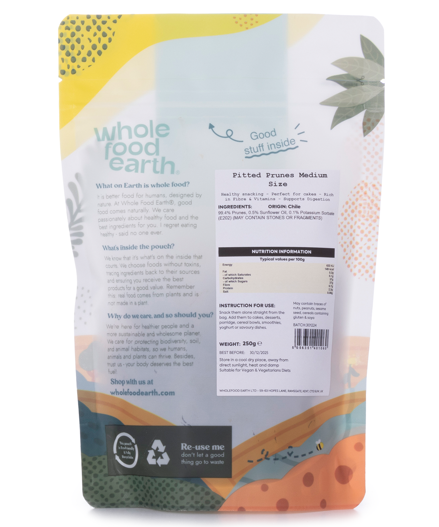 Dried pitted prunes are a great source of dietary fibre & a delicious go-to snack. Add pitted prunes to your morning porridge oats. Use in baking. Combine with nuts, seeds & other dried fruits for a healthy trail mix. Try adding to rich stews for a depth of flavours.