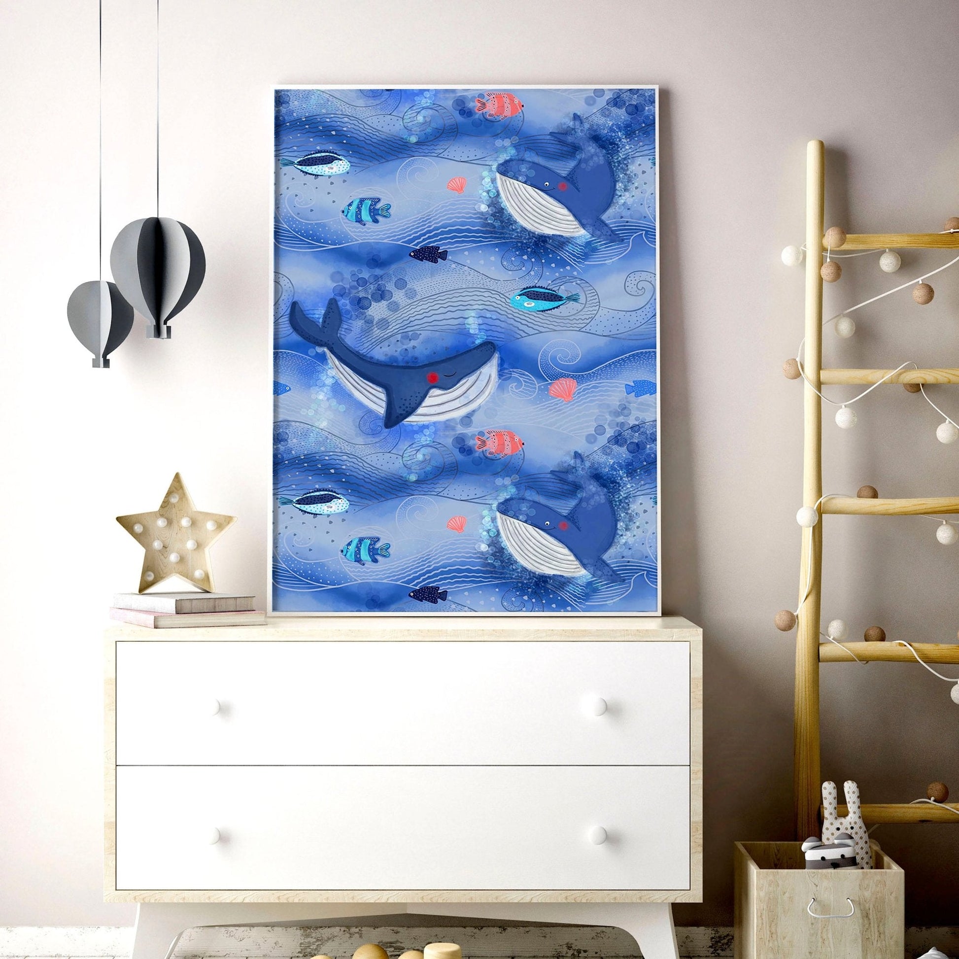 Indeed, each print showcases charming and lovable whale designs gracefully set against a backdrop of soothing oceanic blue. These playful illustrations instantly spark joy and imagination. They will transport your child to a whimsical underwater world of friendly marine creatures. These cute whales' gentle presence will add tranquillity and wonder, fostering a love for the ocean and igniting their curiosity.