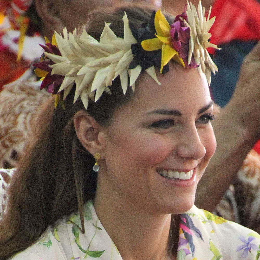 A winning combination. Gold and green drop stone earrings are a vibrant addition to the original style worn by Catherine, the Princess of Wales. This green onyx option will make a great addition to your collection and make a versatile partner for many outfits.