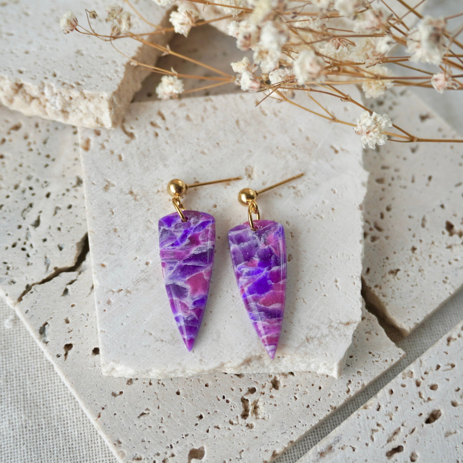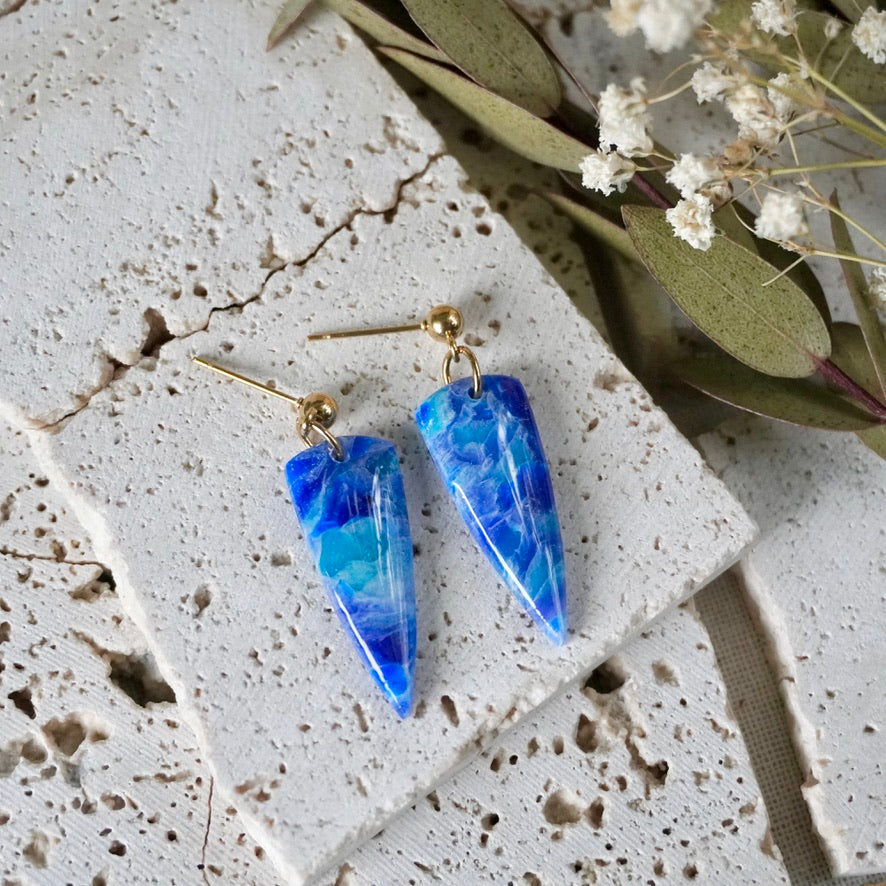 The creative process to craft the unique colour and stone like effect involves a mixture of translucent polymer clay, combined with an array of inks and metal leaf in such a way that achieves a one-of-a-kind finish. To complete the process, it is topped with a transparent resin to really highlight the colour and sparkle!