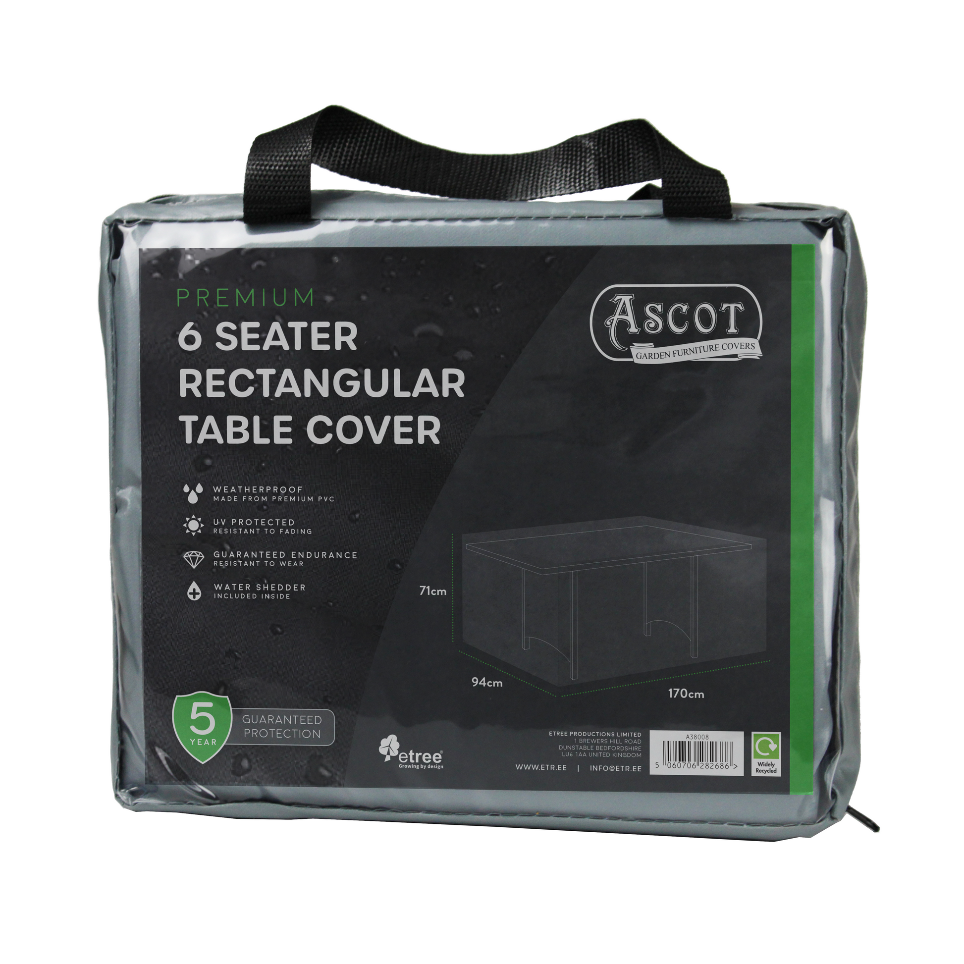 Ascot Garden Furniture Covers are available in three stylish colours: black, green, or grey, so you can choose the one that matches your outdoor space. And with a 5-year guarantee, you can rest assured that your furniture will remain protected for years to come.