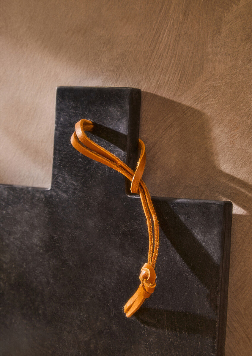 The board has a slightly textured surface while providing a wide area for cutting items or serving, cheese, or serving antipasti. The board can be stored to save space with its hanging hole in the handle decorated with a small rope strap.
