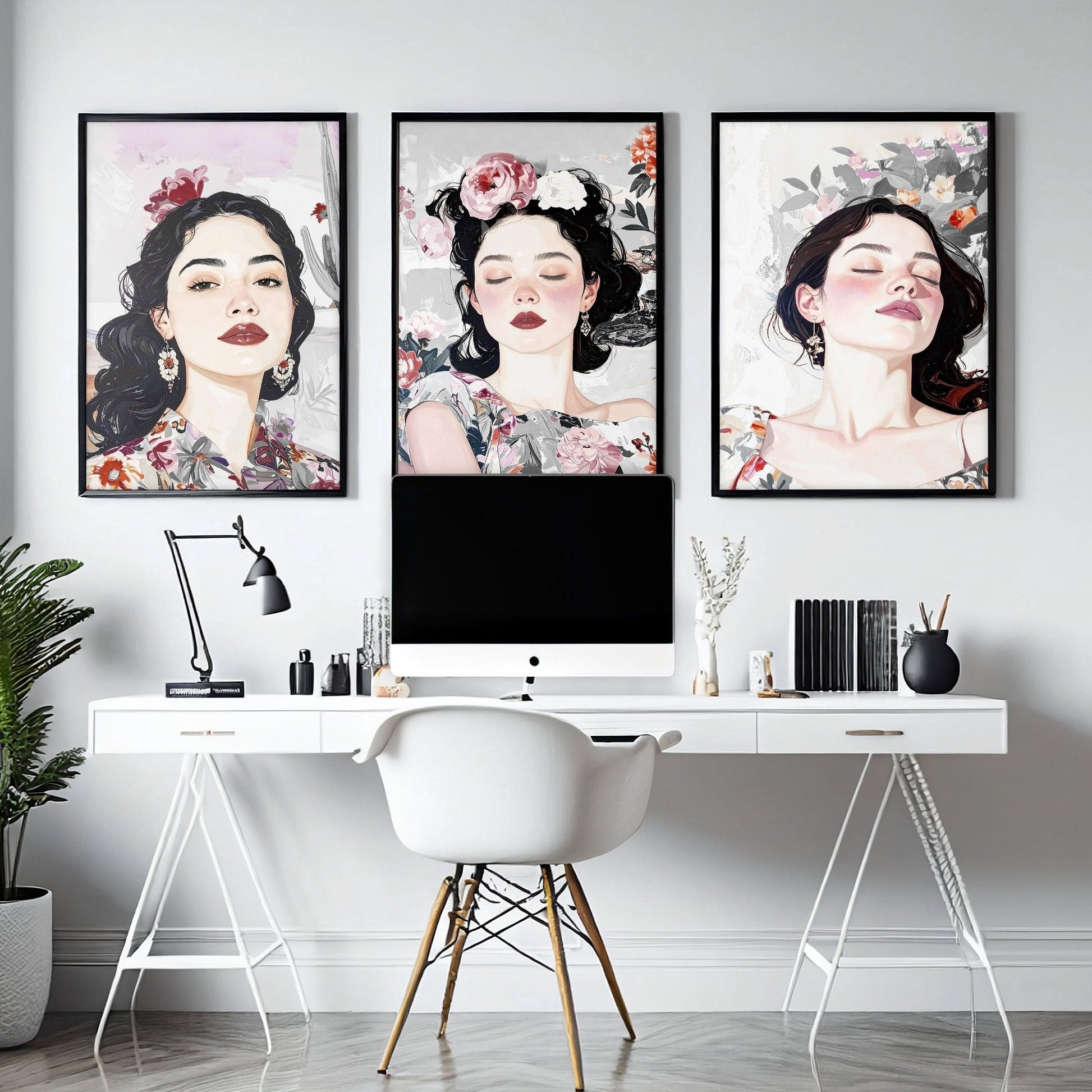Transform your office decor with our stunning Print Sets of 3! Featuring a Set of 3 Boho Women Wall Art Prints, this unique collection captures the spirit of free-spirited elegance. Each print, awash in a multicolour palette, merges seamlessly with any office style, breathing new life into your workspace. Imagine the fusion of earthy tones with vibrant accents—the boho style adds a touch of whimsy and warmth, transforming a plain wall into a visually striking masterpiece.
