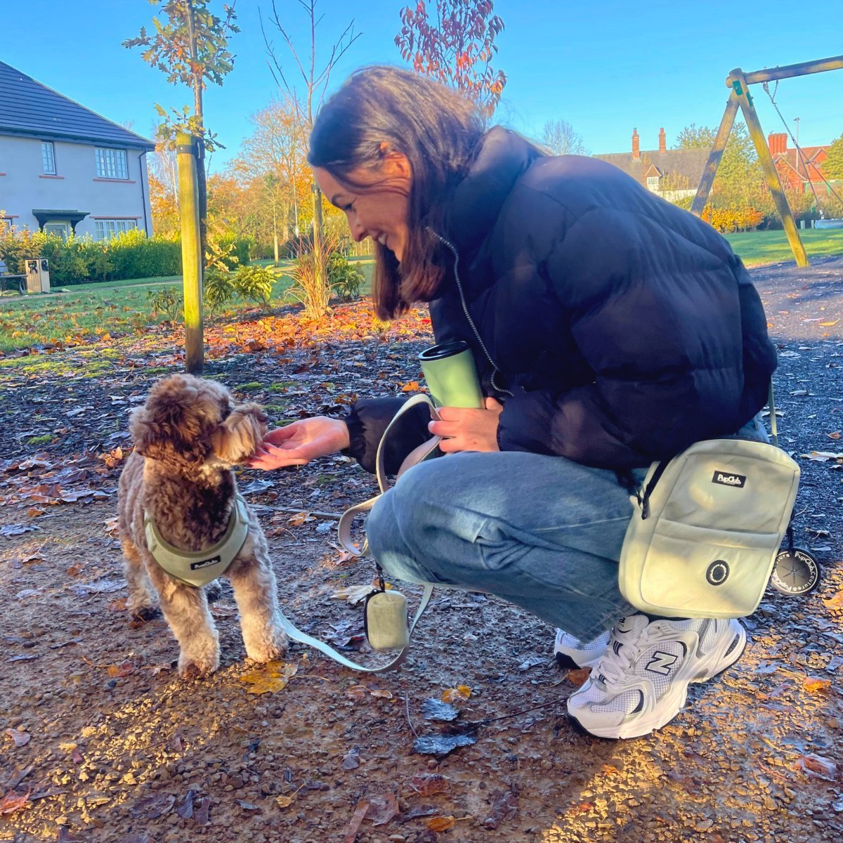 Introducing our NEW Mini Dog Walking Bag – In a stunning Sage Green waterproof nylon material, these cross body bags are the ultimate companion for your dog walking adventures!