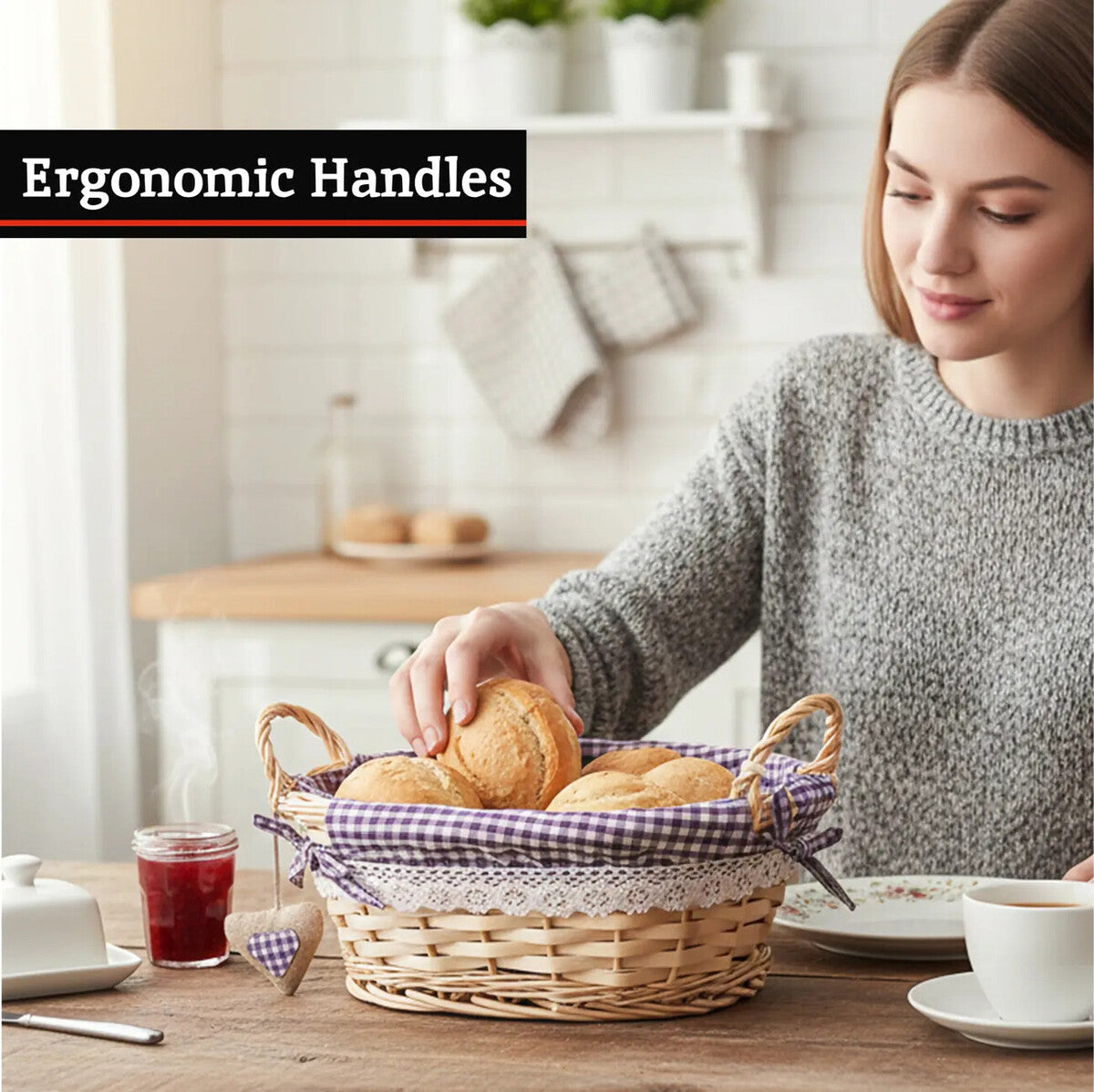 Designed for everyday use, the willow basket brings a classic woven look, while the purple gingham lining adds a cheerful, homely finish. It suits breakfast tables, afternoon tea, and family dinners where presentation matters.