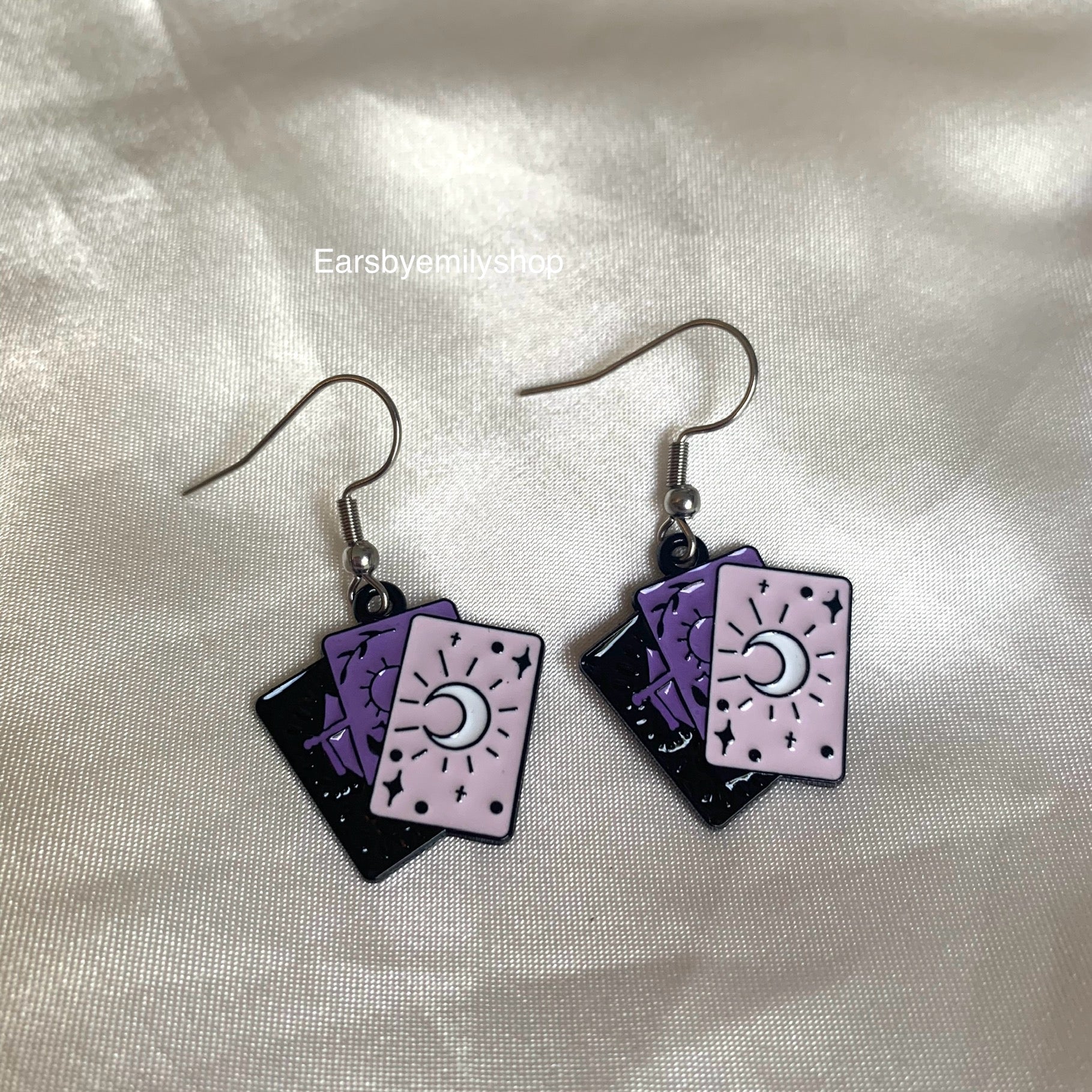 A cool pair of purple tarot card dangle earrings. These earrings have surgical steel hooks, making them hypoallergenic.