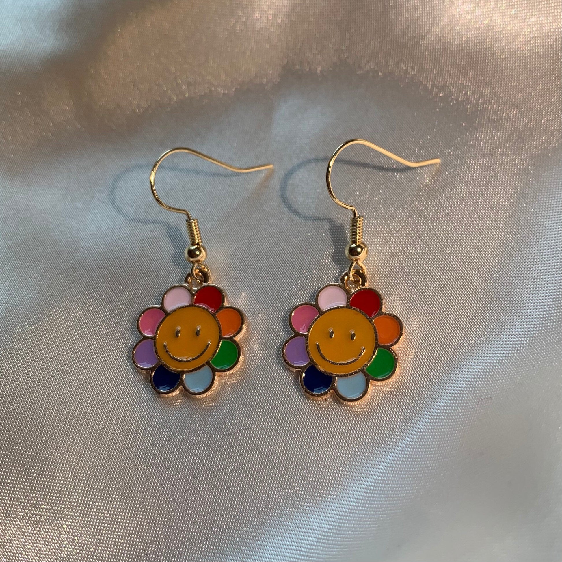 A cute pair of rainbow smilie flower earrings on a 18k gold plated hooks.
