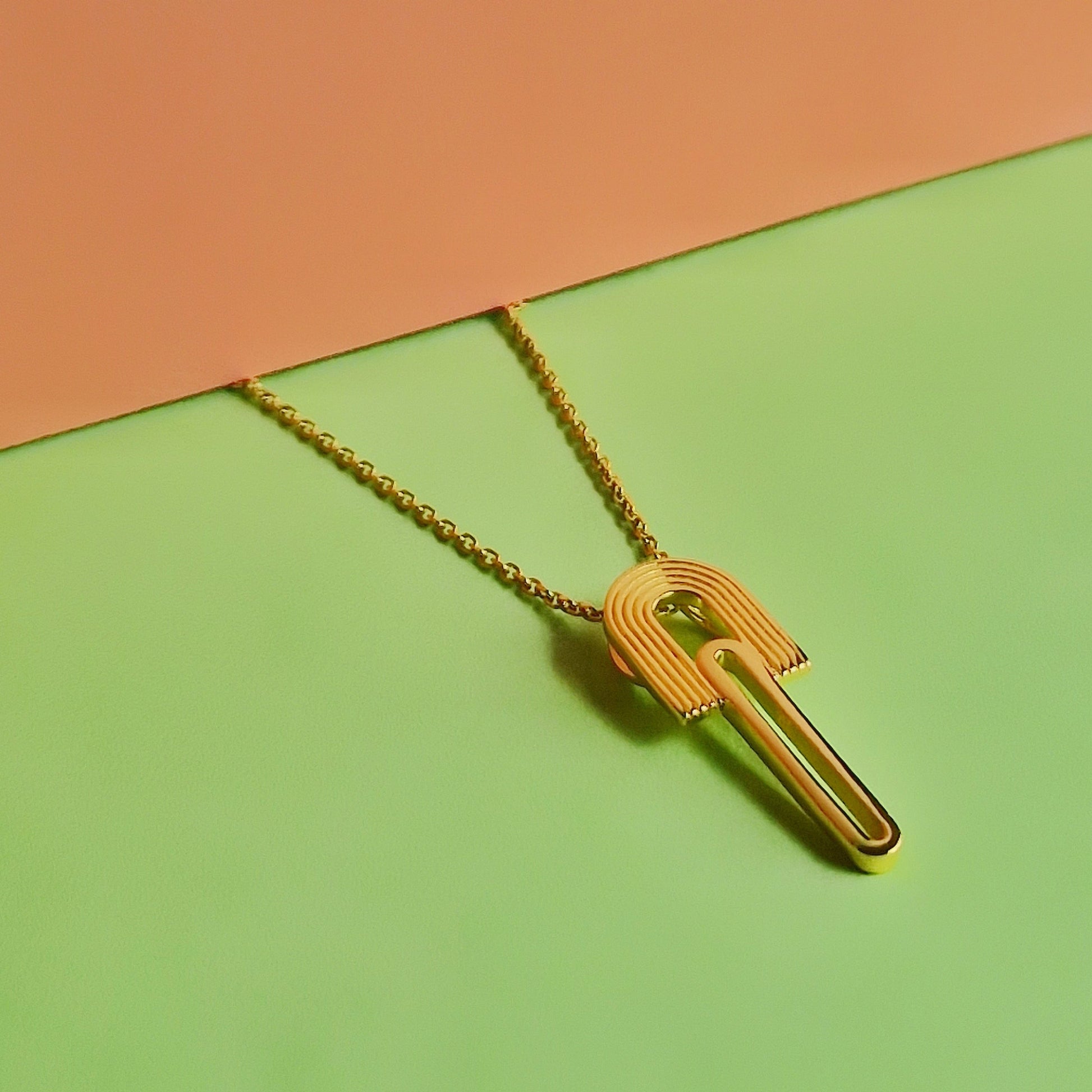 This Gold Rainbow Necklace is a unique, beautiful piece inspired by the rolling hills of Cambodia. Its art deco design captures the abstract beauty of a golden rainbow, perfect for any special occasion.