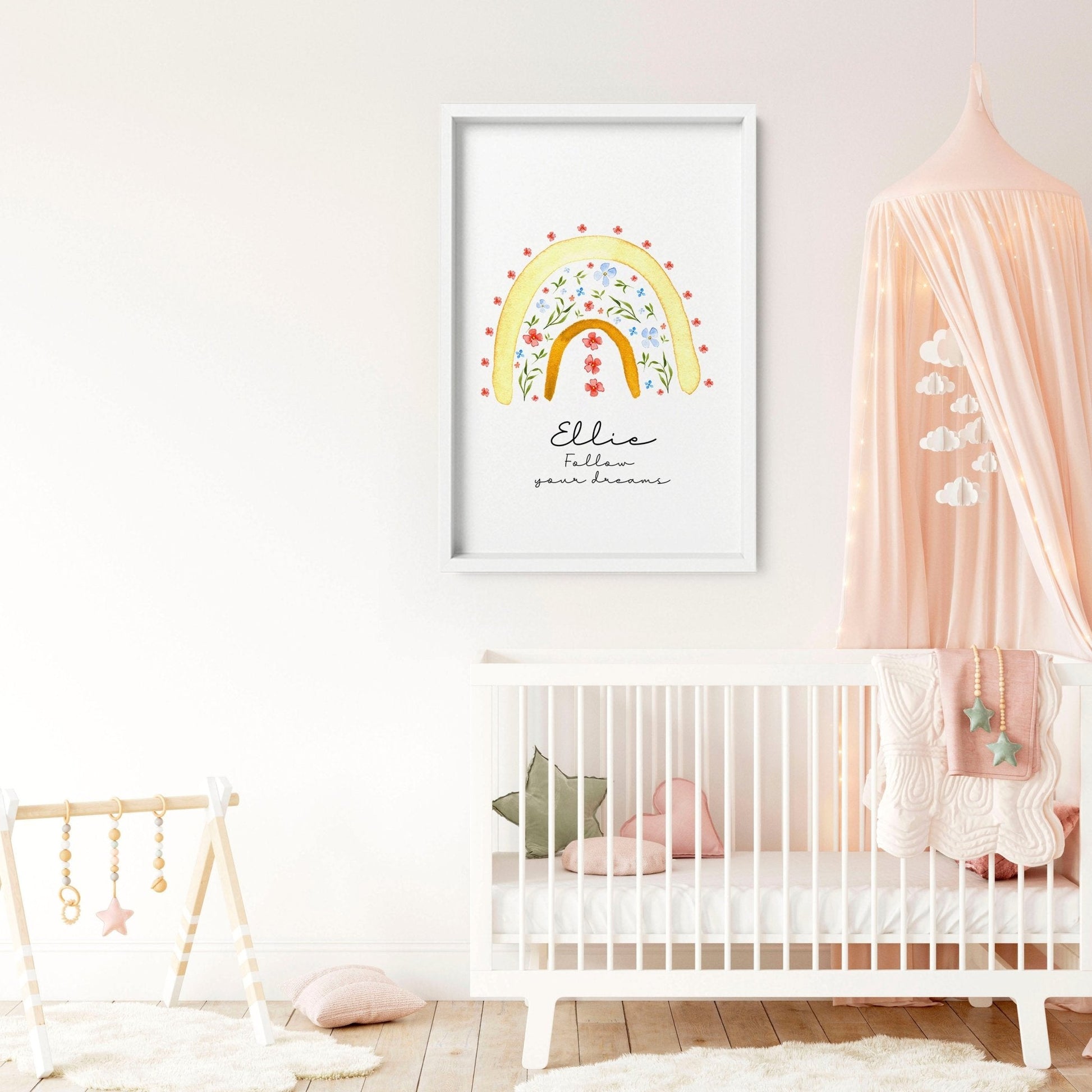 Finally, transform your little girl's room into a haven of creativity and imagination with our personalised rainbow nursery decor. The soft yellow tones and floral elements create a soothing and magical ambience that will inspire her to dream and explore.