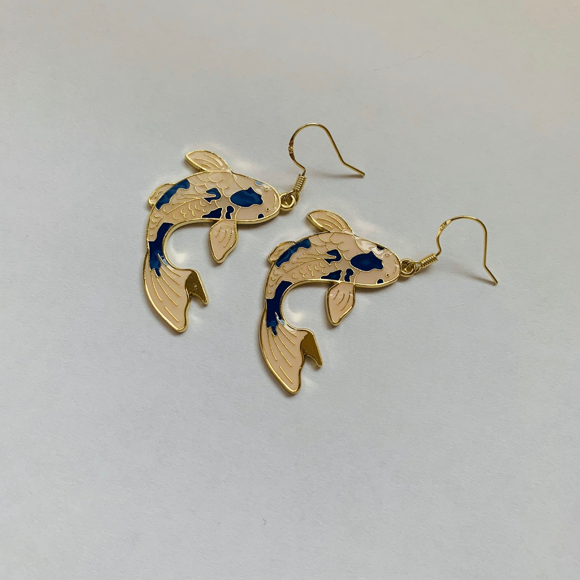A stunning set of red of blue koi fish earrings on 18k gold plated hooks.