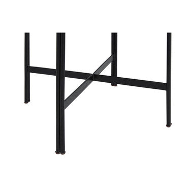 The look is grounded by a sculptural base of iron in a deep black finish. Four legs extend into a cross brace that enhances stability while maintaining a light footprint.