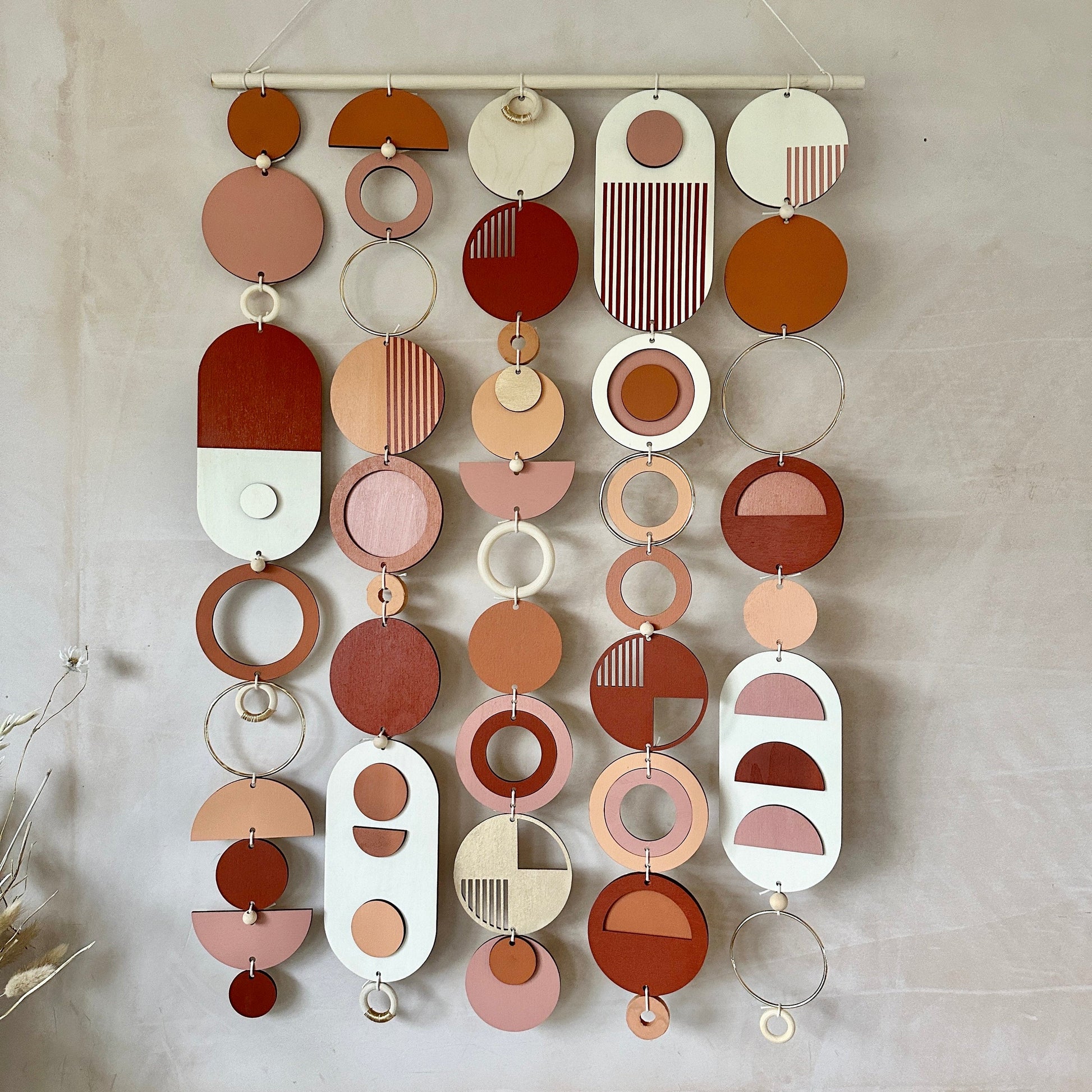 Gold coloured metal hoop detailing and laser cut pieces make this one of my hybrid pieces (using parts from all of my wall hangings).