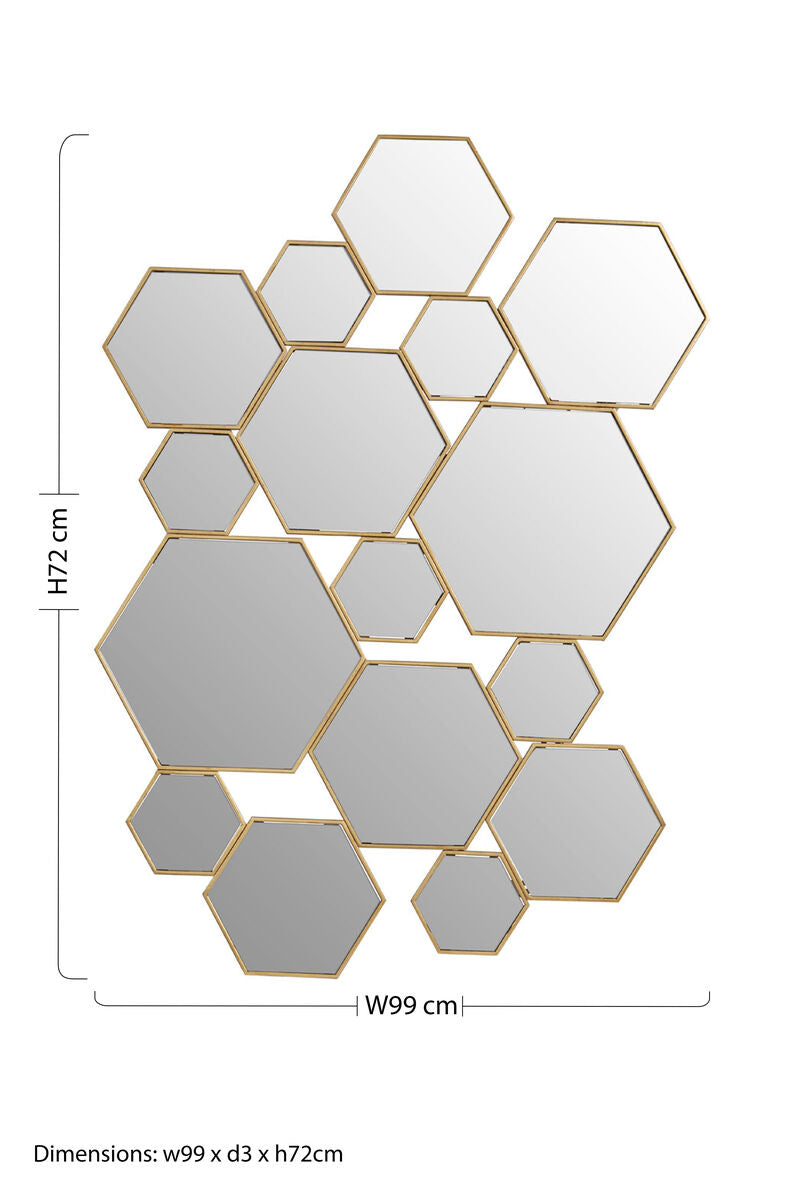 Each slim hexagon features a reflective gold finish that reads bright yet sophisticated. Grouped together, the shapes form a flexible composition that works over sofas, consoles, or beds to expand visual width and height. The Rio Wall Mirror design is ideal for rooms that need both ornament and light distribution.