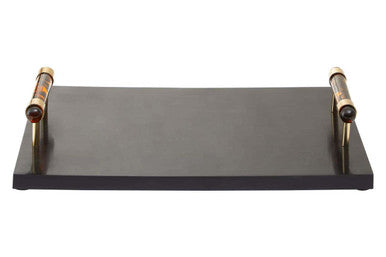This top quality build black rectangular tray can be an elegant and contemporary platform to display your decorative trinkets. The tray boasts a luxe appearance with gold finish metal supports holding superior quality resin handles. The black and gold resin handles feature a faux tortoise shell design that coordinates well with the modern look of this stylish Roma tray.