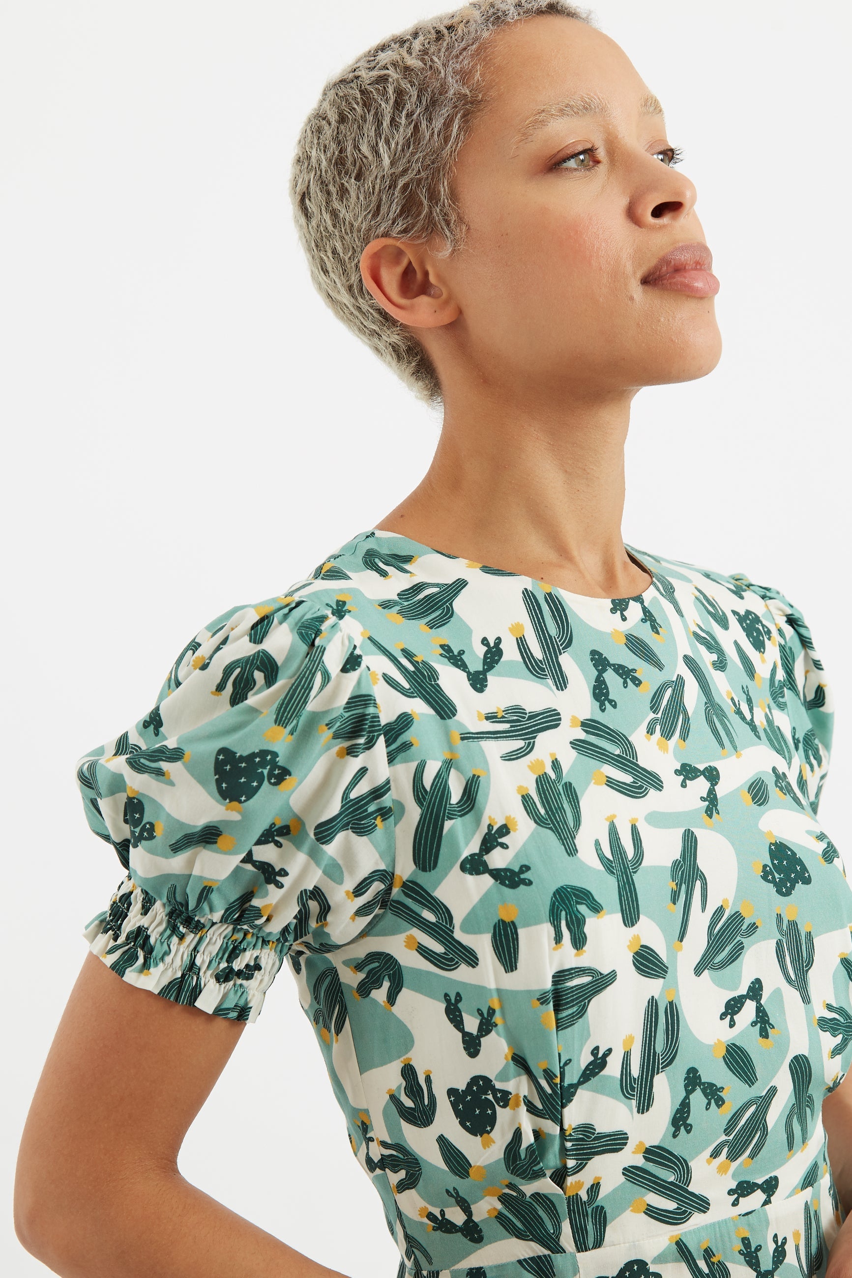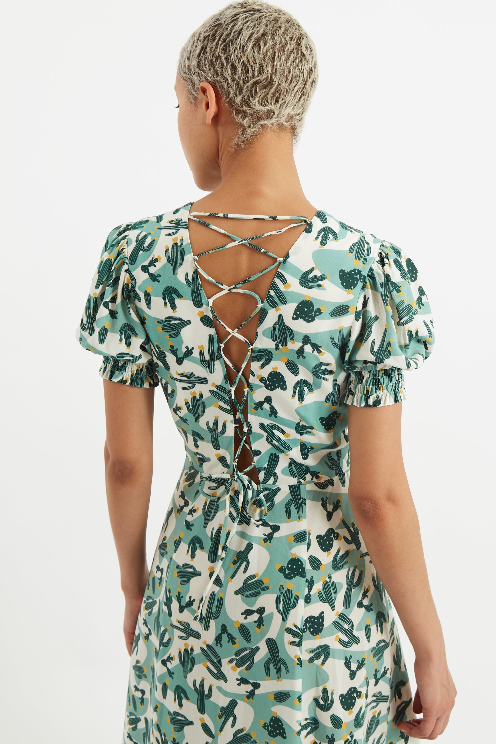 Introducing Romola, a figure skimming midi dress with delicate puff ball sleeves with elasticated shirred cuffs and an incredible lace up statement back. Crafted in our unique Arizona print. Pair with cowboy boots for a laid back vibe or heels for an occasion.