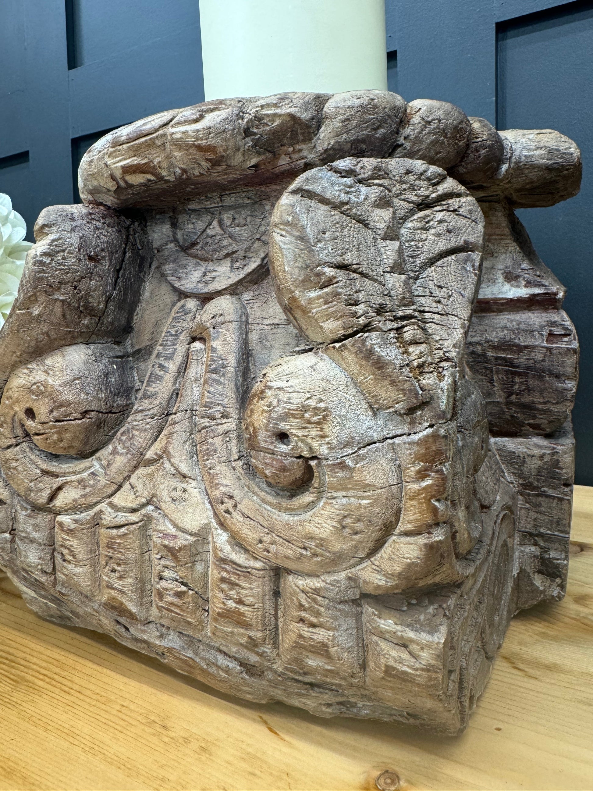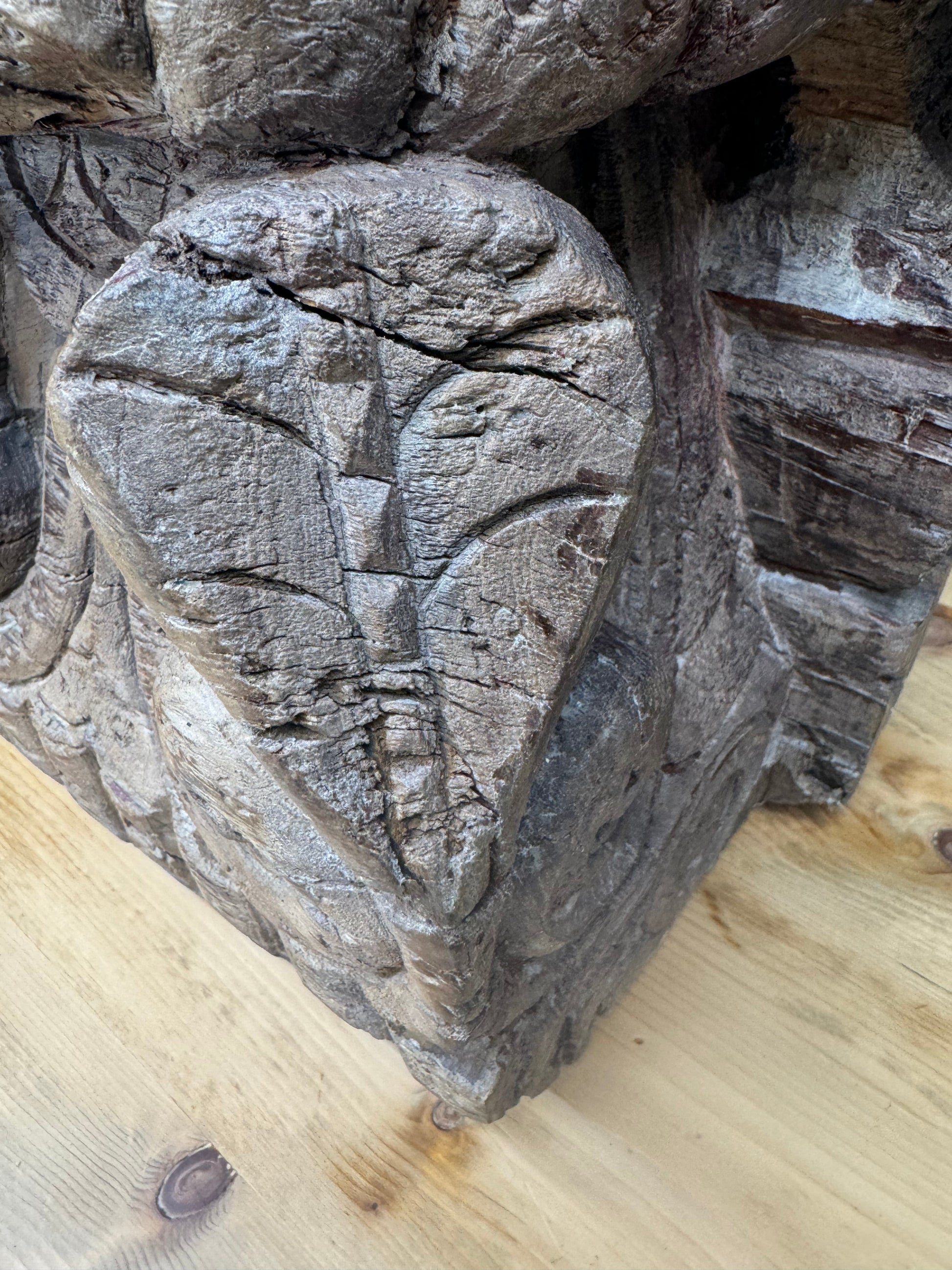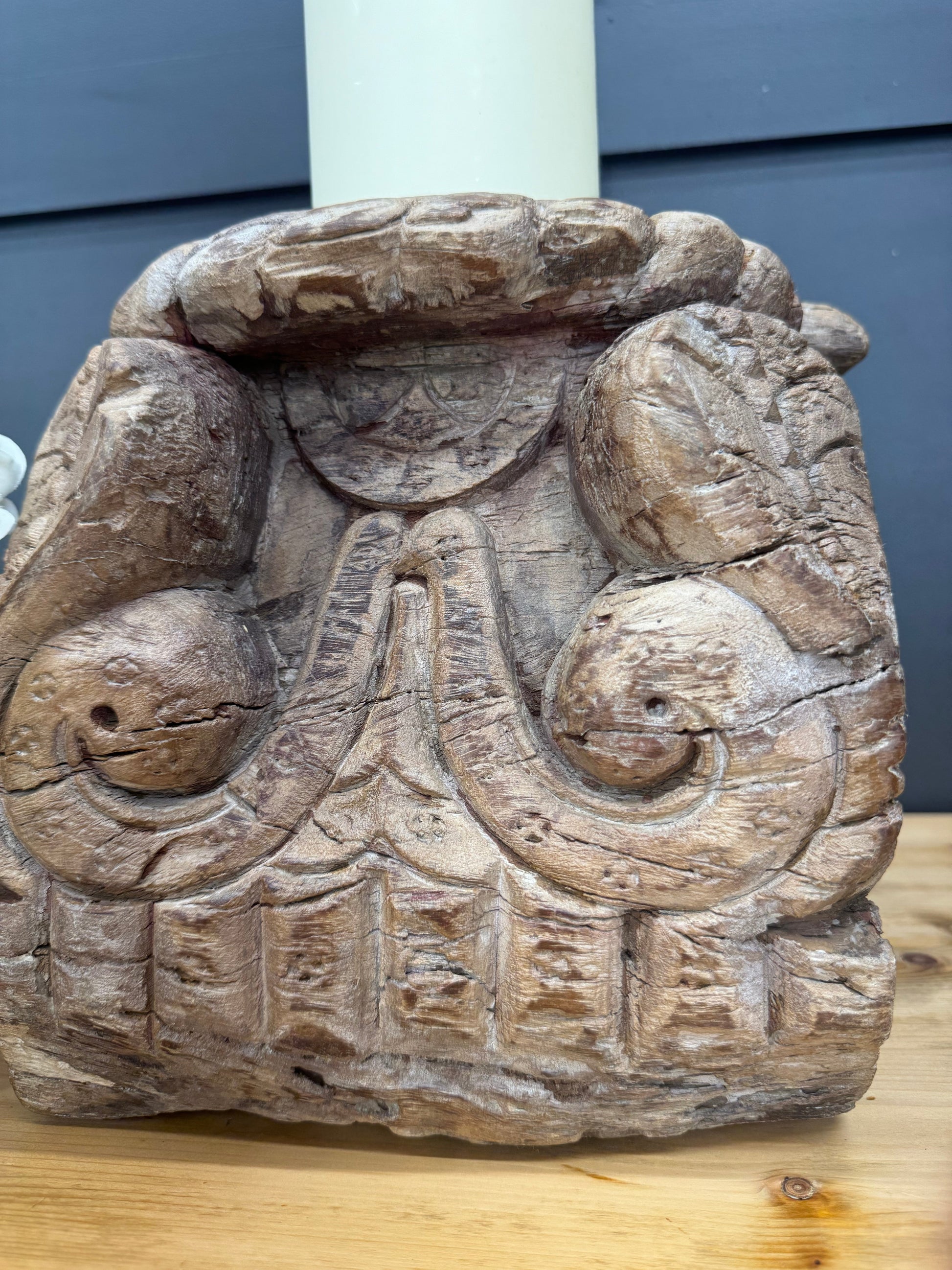 Add a touch of vintage charm to your home with this XL unique Indian pillar base church candle holder. Crafted from solid reclaimed wood in a rustic finish, this piece is solid and VERY heavy, showcasing the craftsmanship of recycled antique architecture. The aged wood exudes character and history, making it a truly special addition to any space. Painted in a distressed finish using vegetable dye. Originating from India, this candle holder is not just functional but also a statement piece that will enhance the ambiance of your home. Candle not included. Dimensions are approximately
