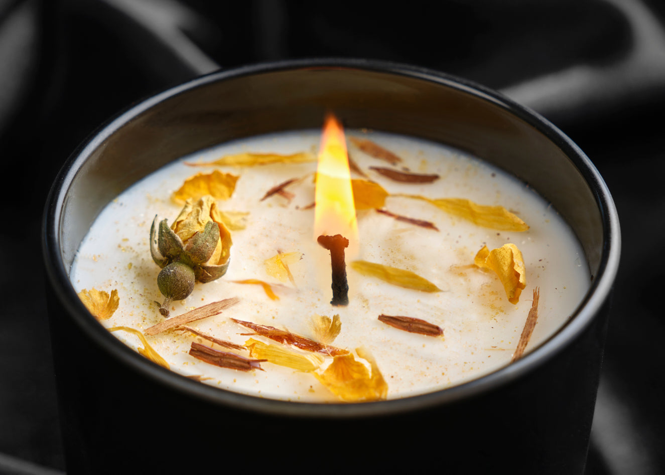 This candle has been finely crafted and finished with botanicals of Yellow Rose, Calendula petals & Catuaba Bark.