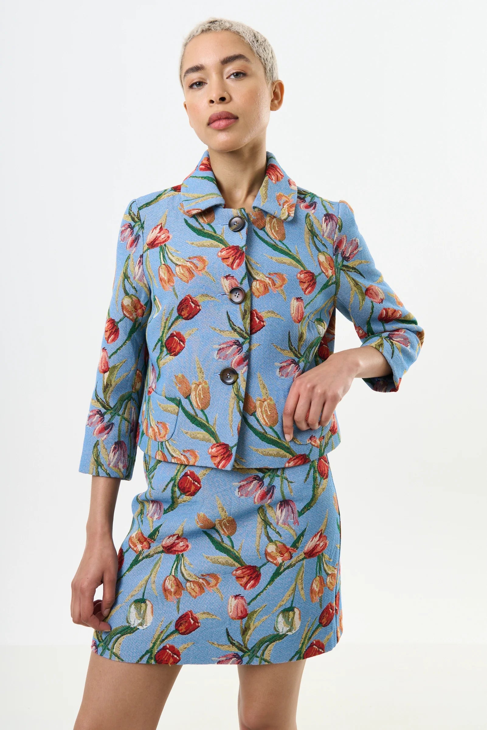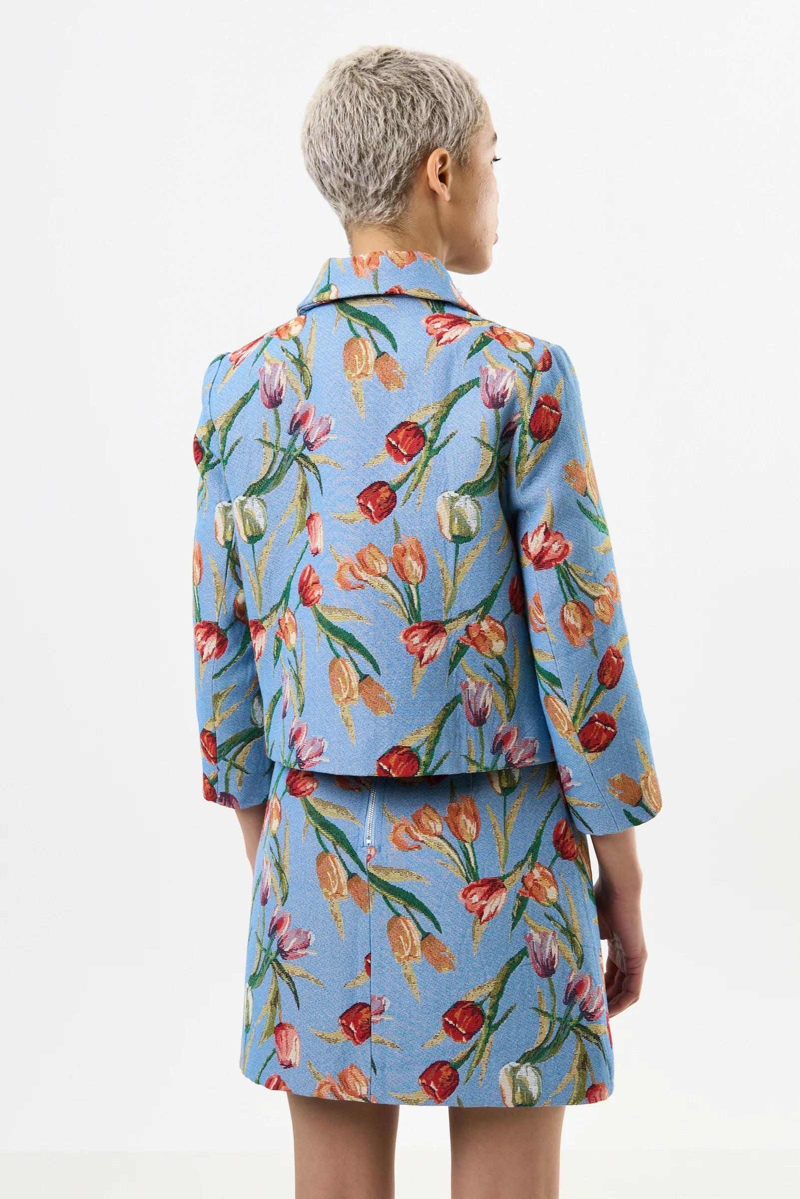 Add some flair to your wardrobe with our Salut Tulip jacquard short jacket on pale blue ground. This neat bracelet sleeve cropped jacket boasts a stunning tulip jacquard design that pairs perfectly with the matching Aubin skirt. Or, for a more casual look, add it to your favourite denim for a new dimension.