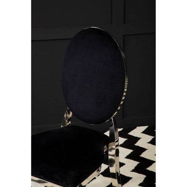 This elegant chair is sure to make a statement with its stainless steel frame in the polished silver finish which contributes to the luxe effect. Its black velvet seat and oval backrest complement the smooth, angular lines of the frame and form a monochrome contrast with it.