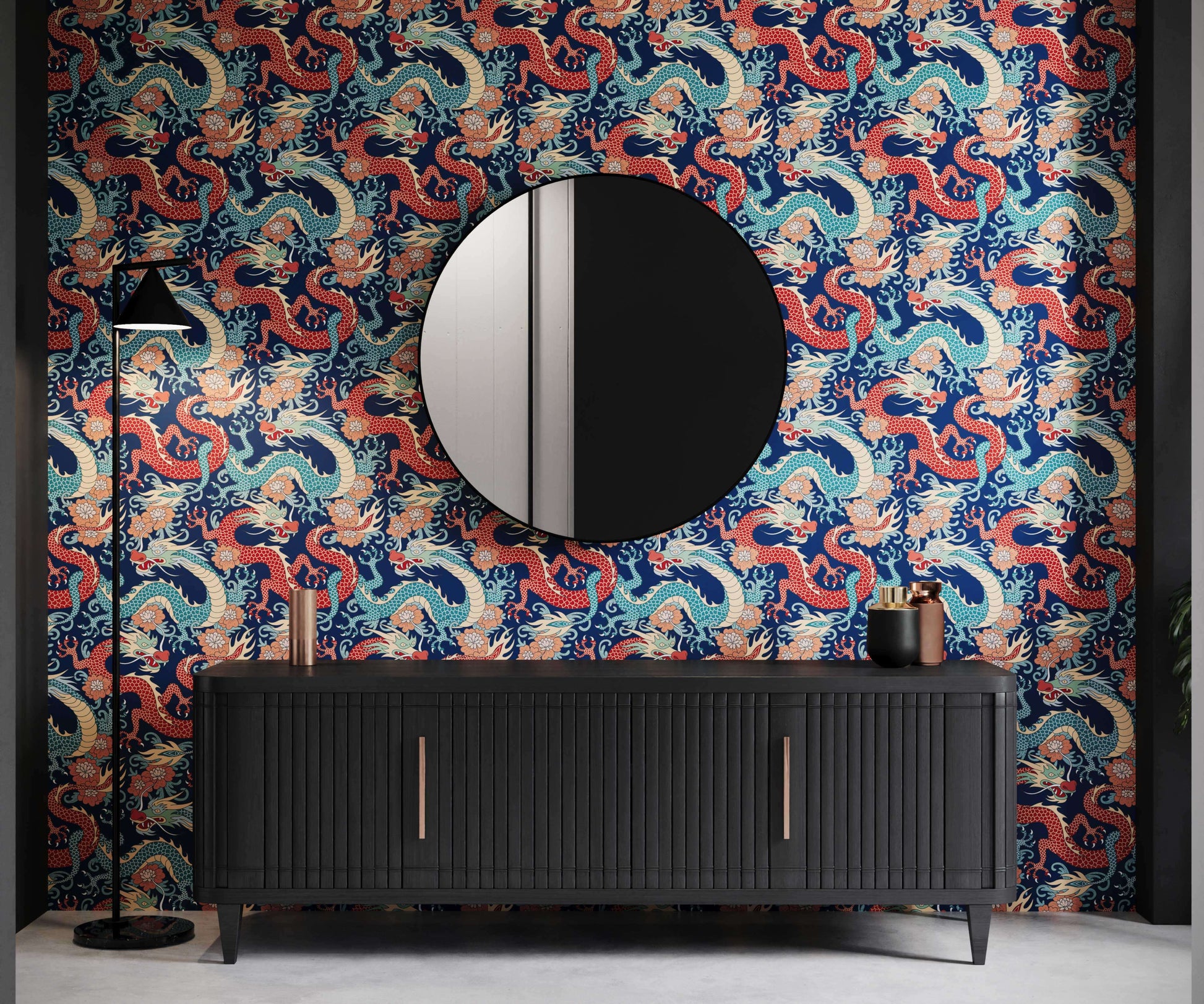Attention grabbing and authentic, our 'Scute' wallpaper adds a modern touch to something very historic. Featuring numerous oriental dragons presented in striking colours, this design really allows these amazing mythological creatures to stand out and take centre stage. The contrasting bold colours in this wallpaper really benefit from our ultra sharp print quality and luxurious paper.
