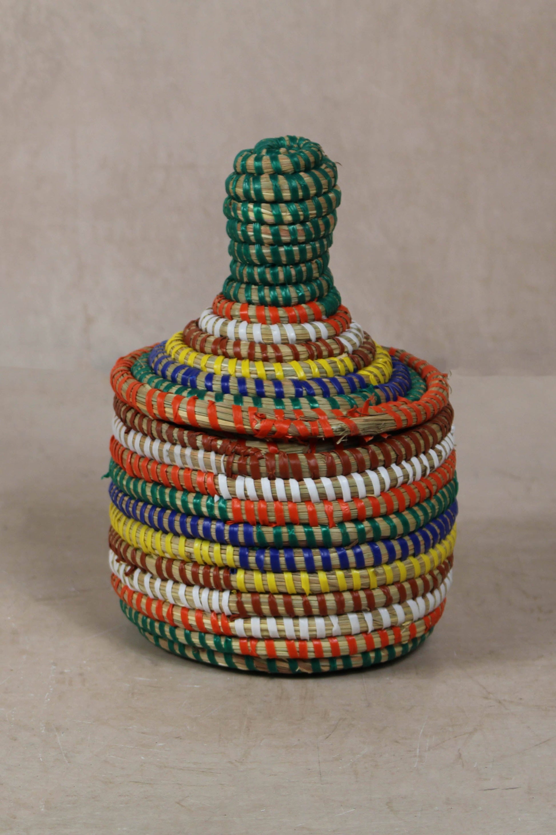 These incredibly special baskets are crafted by the Wolof craftswomen of rural Senegal. They are woven from millet grass and recycled multi-coloured plastic threads, making each basket truely unique and special. Wolof weavers are proud to preserve the coil style of basket weaving by passing the technique from generation to generation. Wolof girls learn weaving techniques from their Mothers and Aunts. Each basket serves to generate critical income to sustain the crafter’s family.