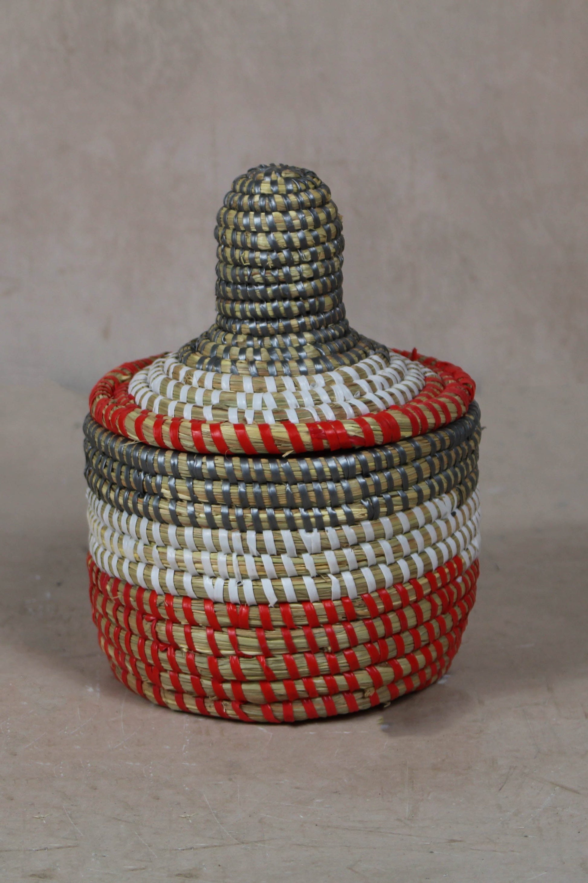 These incredibly special baskets are crafted by the Wolof craftswomen of rural Senegal. They are woven from millet grass and recycled multi-coloured plastic threads, making each basket truely unique and special. Wolof weavers are proud to preserve the coil style of basket weaving by passing the technique from generation to generation. Wolof girls learn weaving techniques from their Mothers and Aunts. Each basket serves to generate critical income to sustain the crafter’s family.