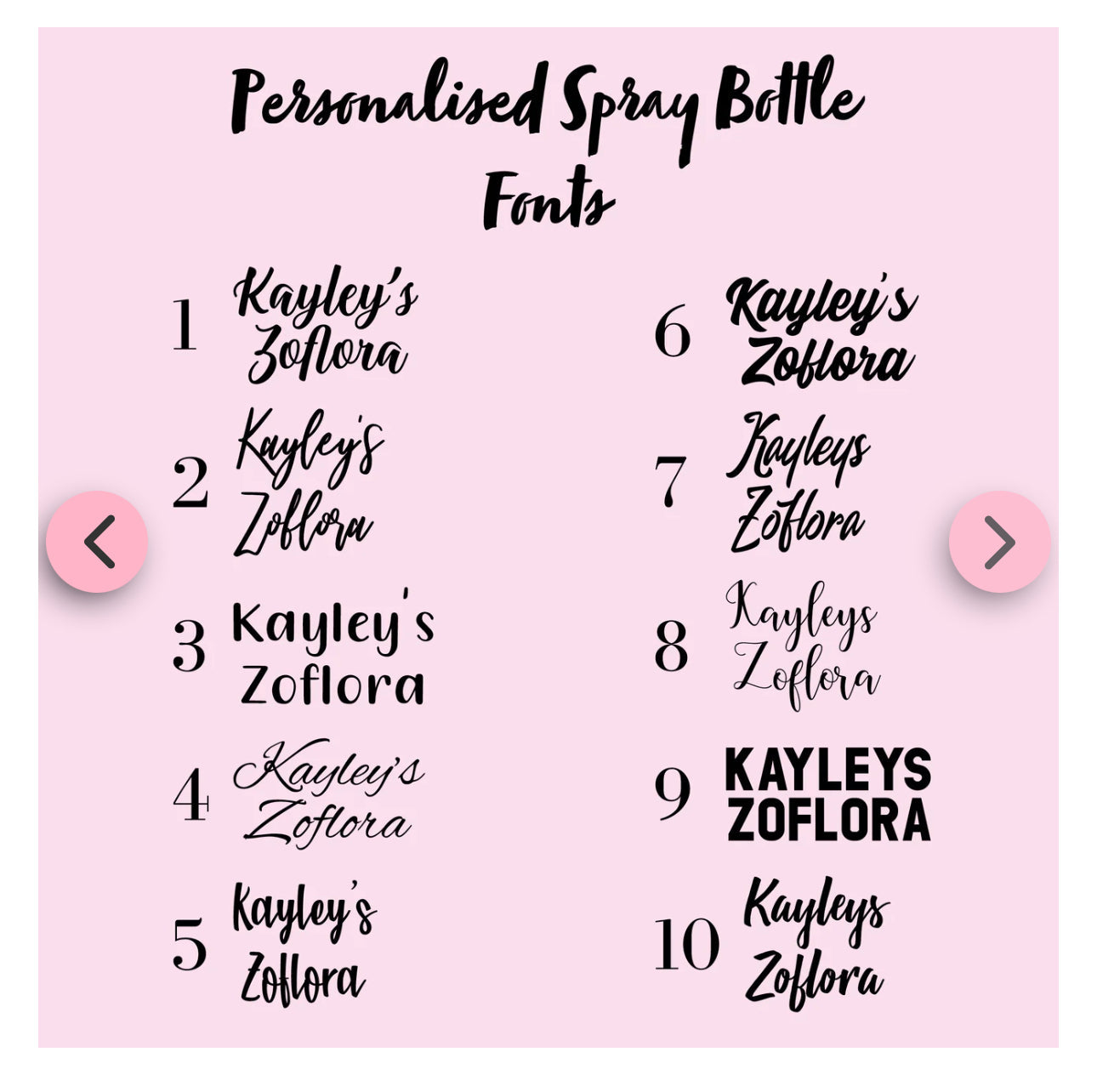PERSONALISED LABELSPlease add the required wording choice and font number in the customisation box. For example: "Kayley's Zoflora" & "Room Spray" in Font 1. We offer a range of font options to make your bottles truly unique.