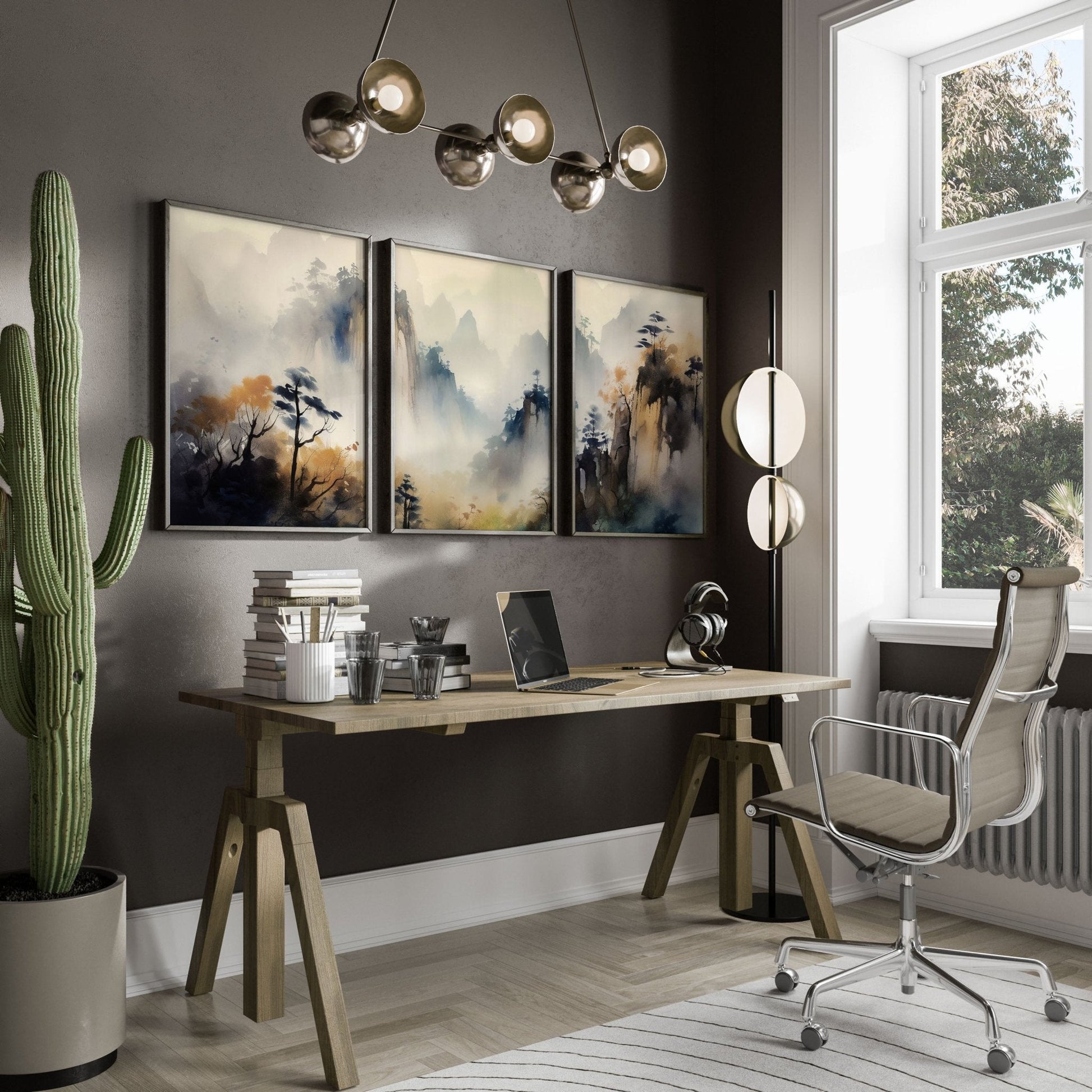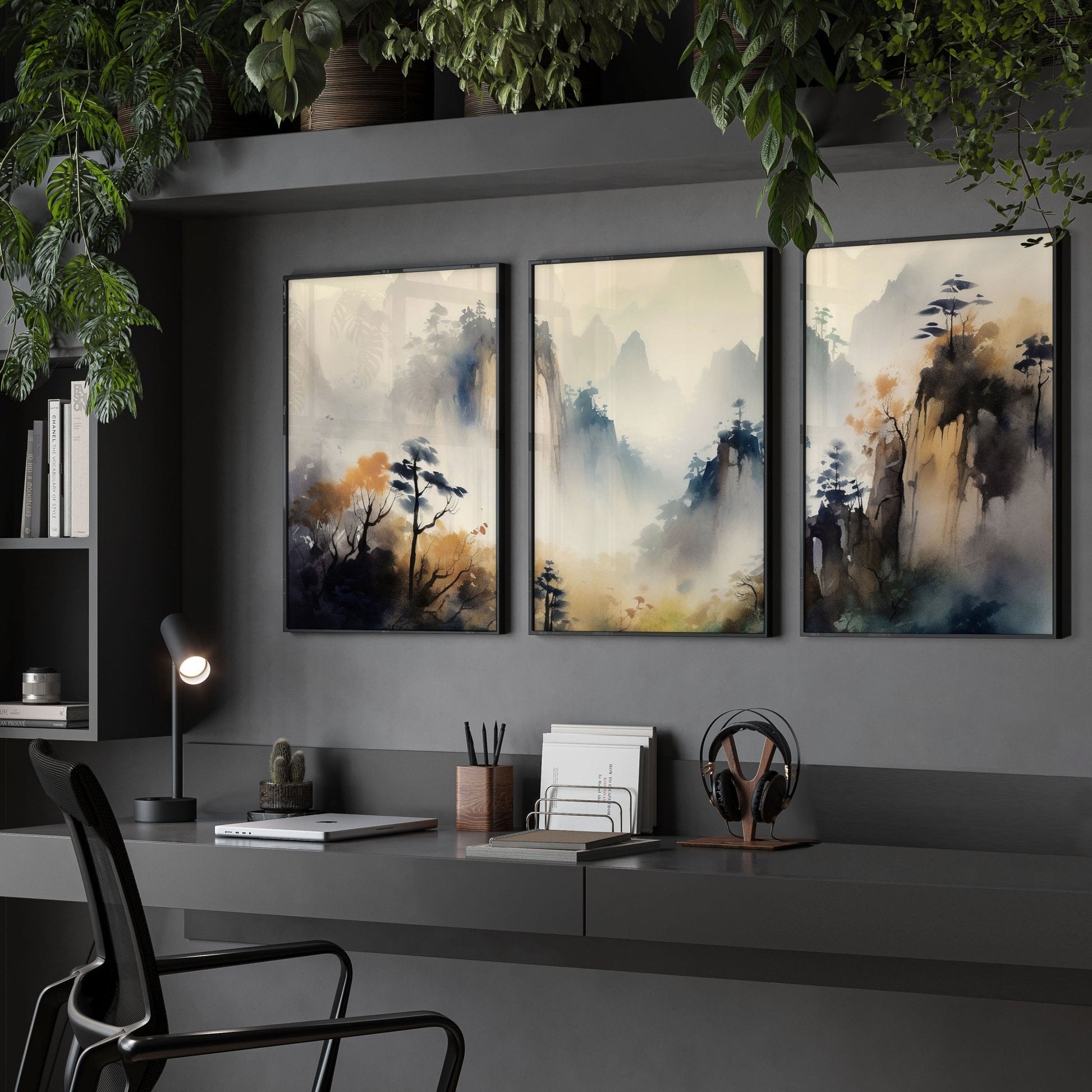 Transform your office into a haven of tranquillity with our Set of 3 Framed Pictures, a carefully curated collection of Set of 3 Asian Inspired Wall Art Prints. These stunning pieces capture the timeless elegance of Asian art, bringing a sense of peace and balance to your workspace. The earth tone palette, rich with warm browns, deep greens, and subtle golds, invokes the calming essence of nature, creating a serene atmosphere that will enhance your focus and creativity.