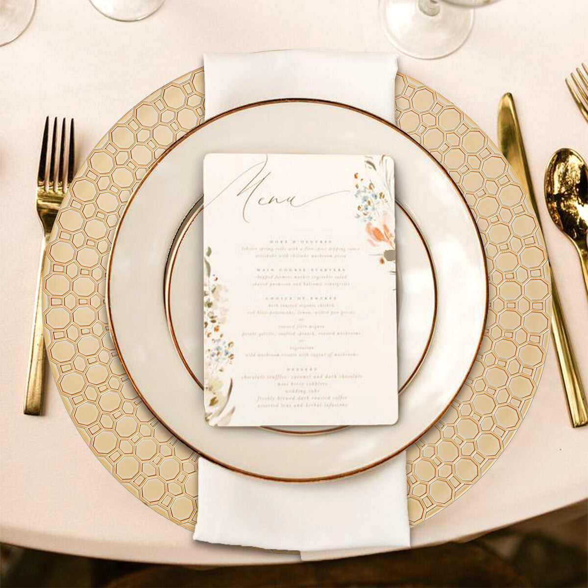 Elegantly designed with smooth edges and octagonal geometric patterned border, these gold charger plates are an ideal tableware addition for the festive season and more.