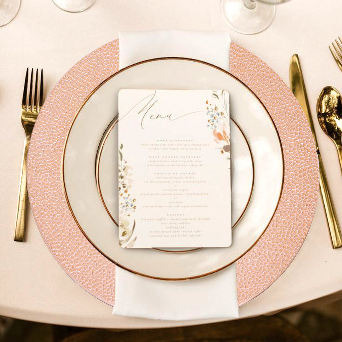 Elegantly designed with smooth edges and pebble effect detail, these rose gold charger plates are an ideal tableware addition for the festive season and more.
