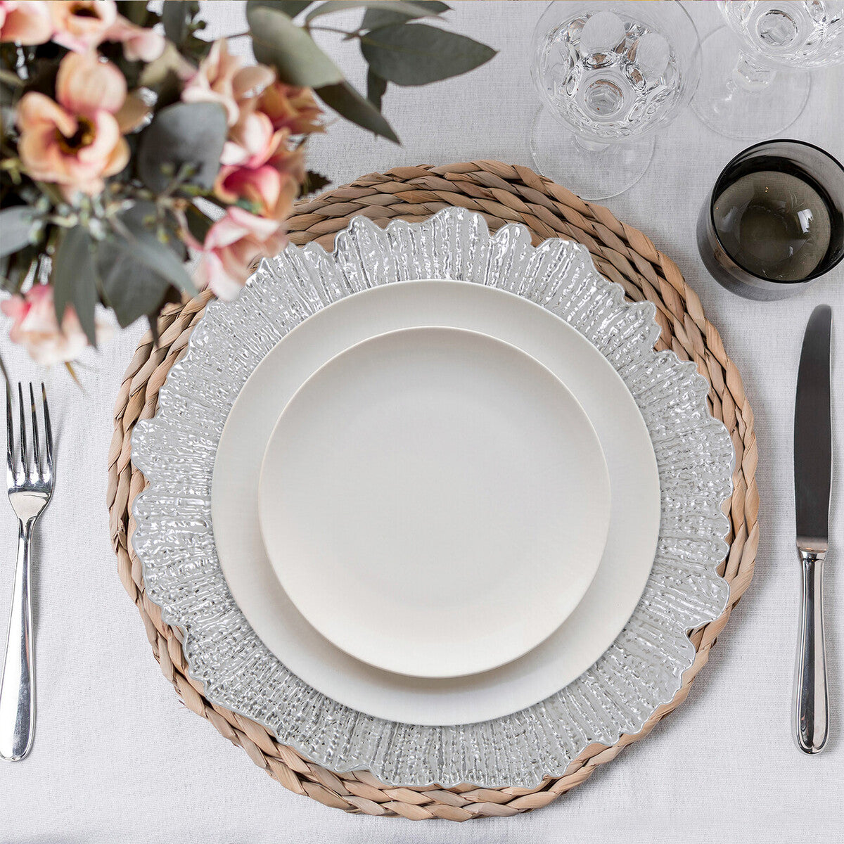 The coastal pattern of the silver charger plates are a beautiful addition to any tableware. The irregular rim and textured surface make it a great option for formal dinners.