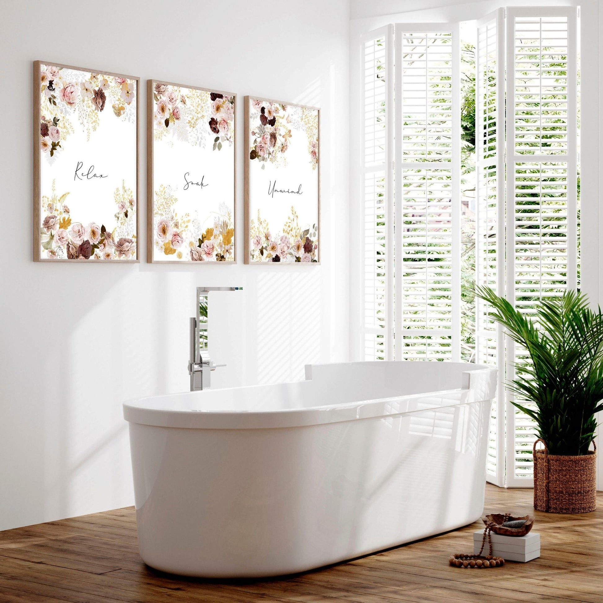 Each piece in this set showcases intricate watercolour Floral illustrations. They are ideal for creating a warm and inviting atmosphere that transforms your bathroom into a cosy retreat. These prints celebrate the enduring allure of shabby chic aesthetics. They will certainly add a distinctive charm to your bathroom space.