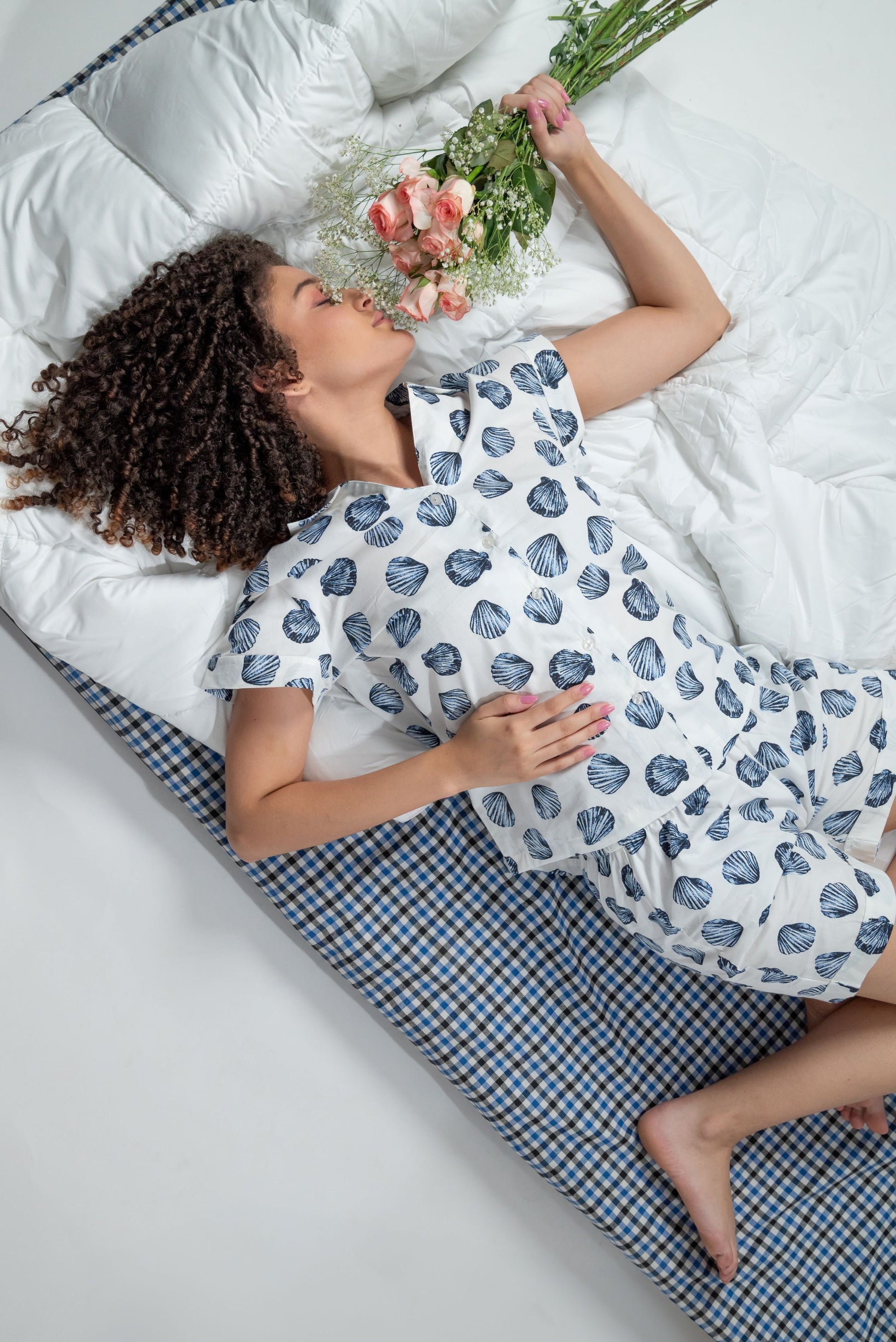 Enter and explore an oceanic state of zen. Shells are often associated with the ocean and the ocean represents fluidity and constant change whilst remaining tranquil and calm. These shell PJs embody the flowing and peaceful energy of the waters with their unique designs. Shells can also serve as a protective covering for creatures inside, which is exactly what our PJ's aim to do. We want you to feel protected, safe and relaxed whilst resting and sleeping.