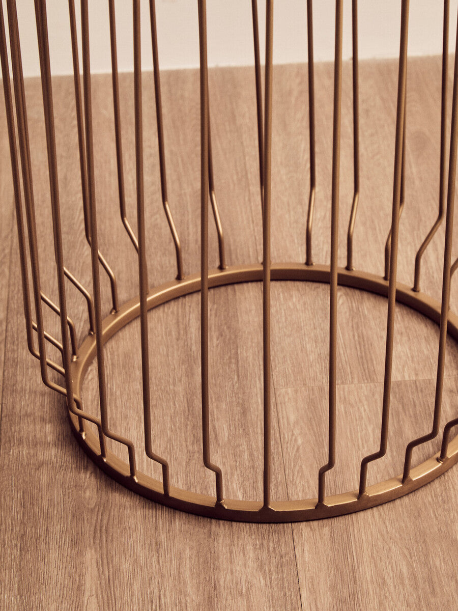 This contemporary table has simple lines which form a symmetrical cage design in a luxe gold finish. A cool white marble top with mild veining neatly sits at the top and coordinates with the open ring bottom. Designed for a contemporary space, style this elegant table next to a clean-lined sofa.