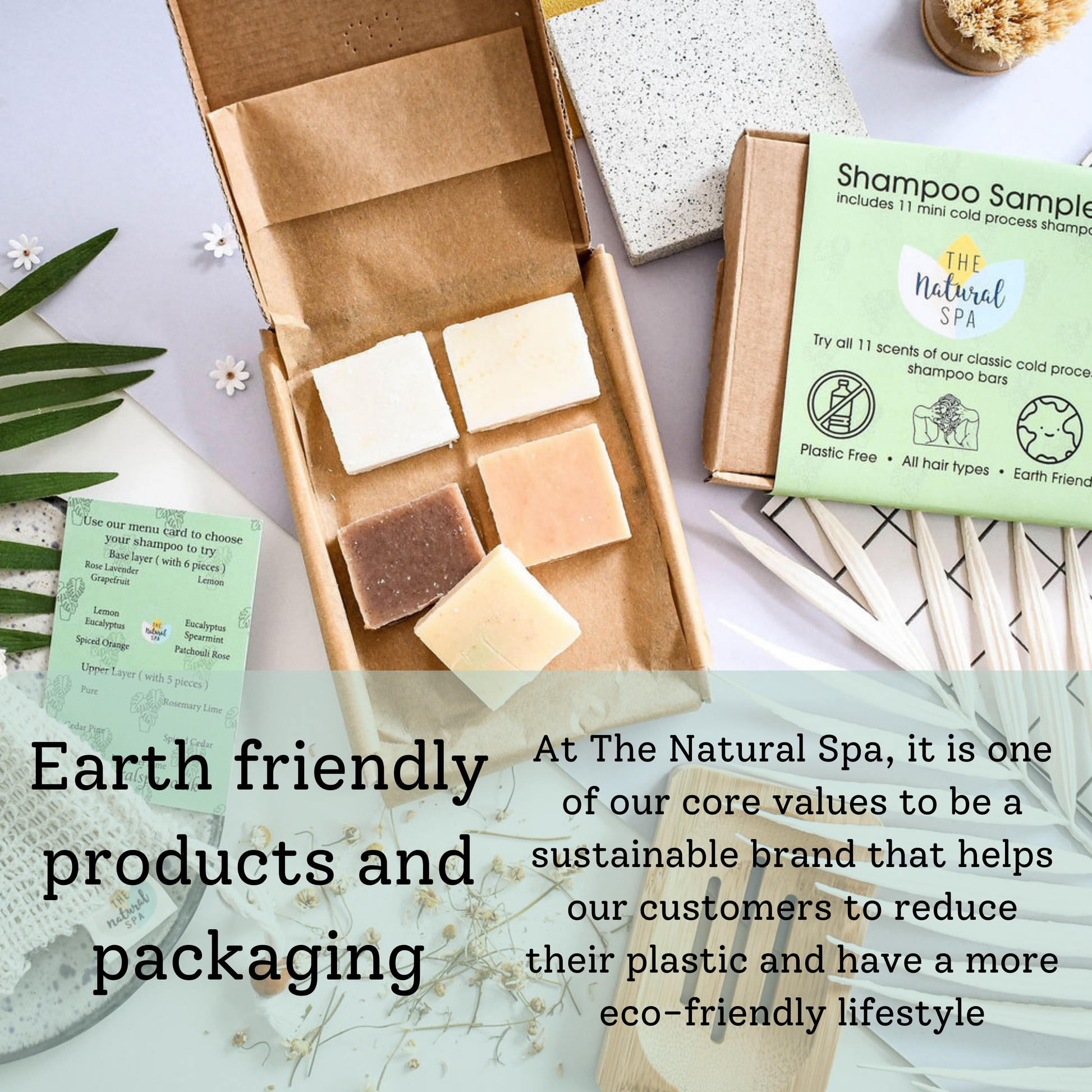 The perfect gift for shampoo bar lovers everywhere, The Shampoo Sampler set provides a perfect selection showcasing a range of scents from our handmade soap offering. You will receive 8 different scents weighing at least 15g
