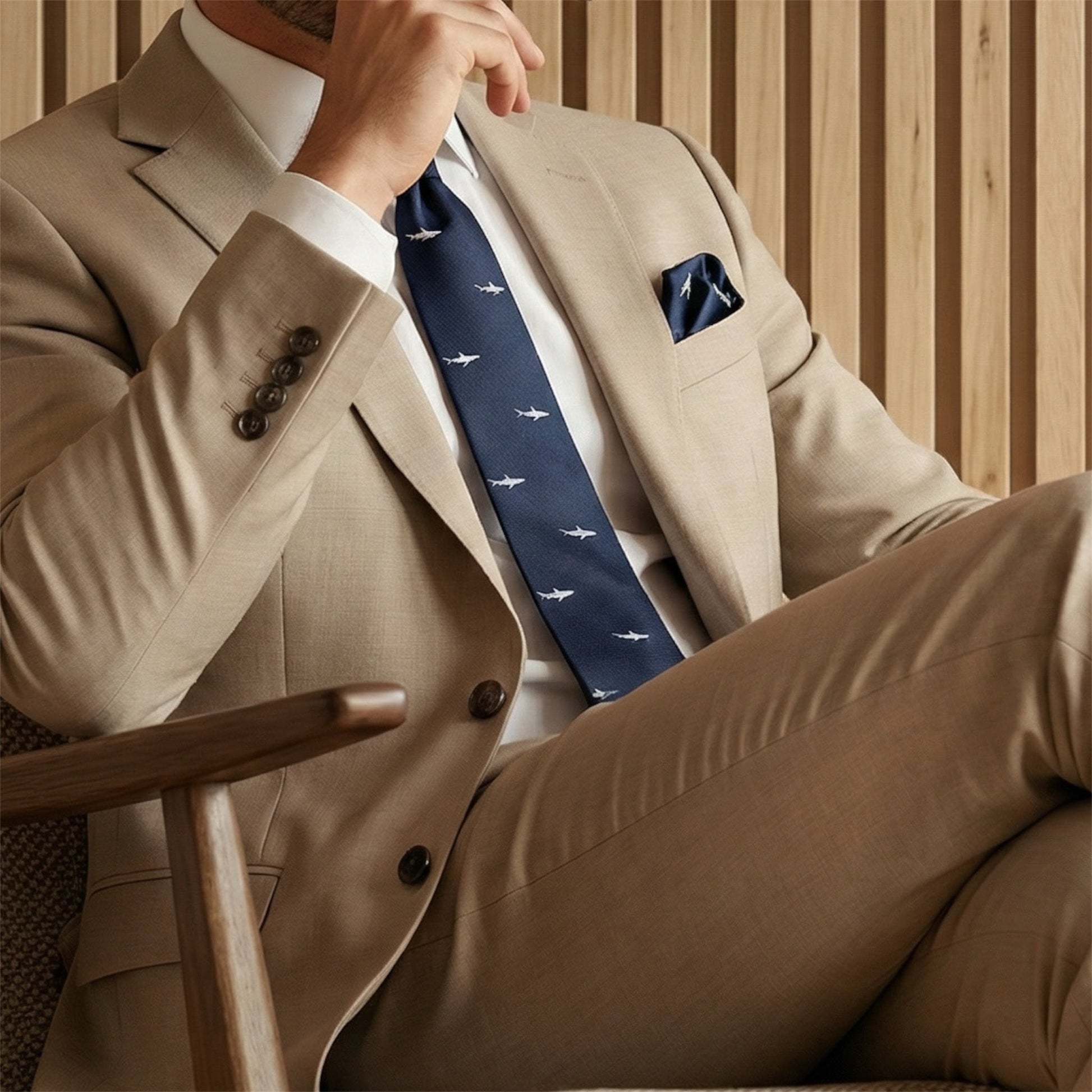 Introducing the shark necktie, featuring a graceful shark gliding through its oceanic kingdom on a deep sea blue fabric. The blue and grey tones capture the beauty of the sea, reminding us of the majestic creatures swimming in their aquatic habitat.
