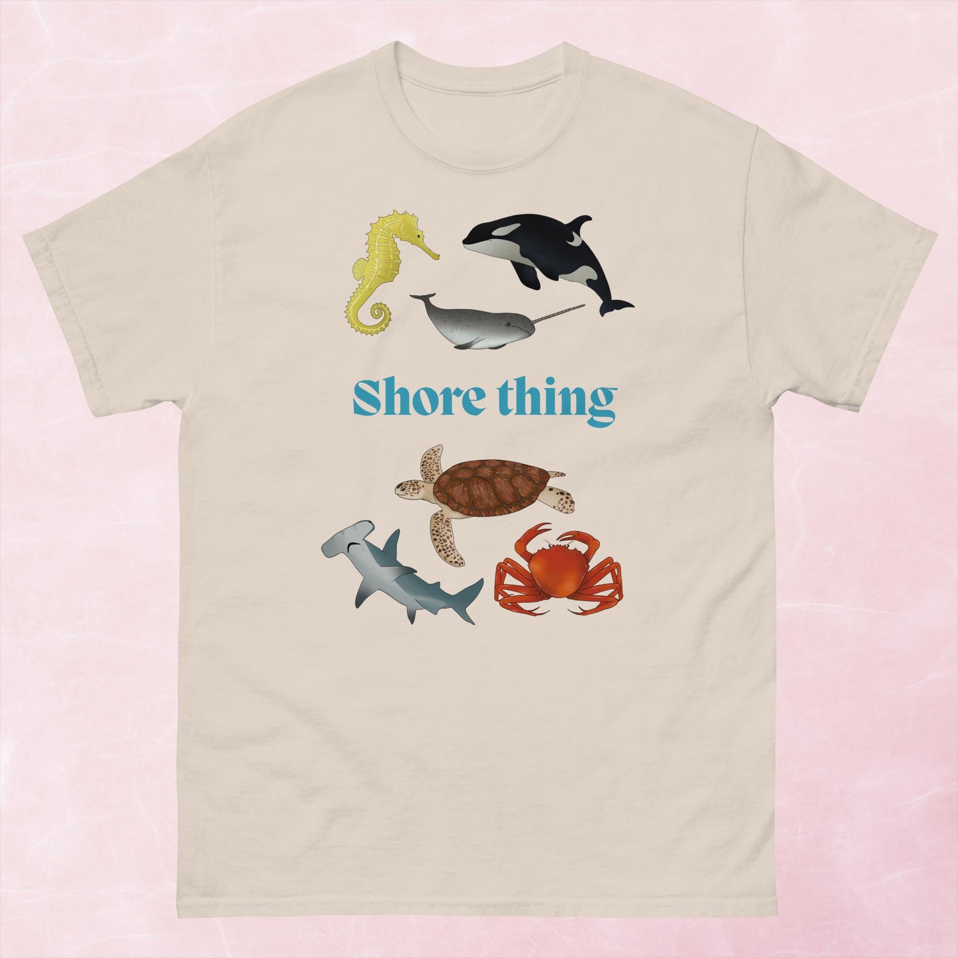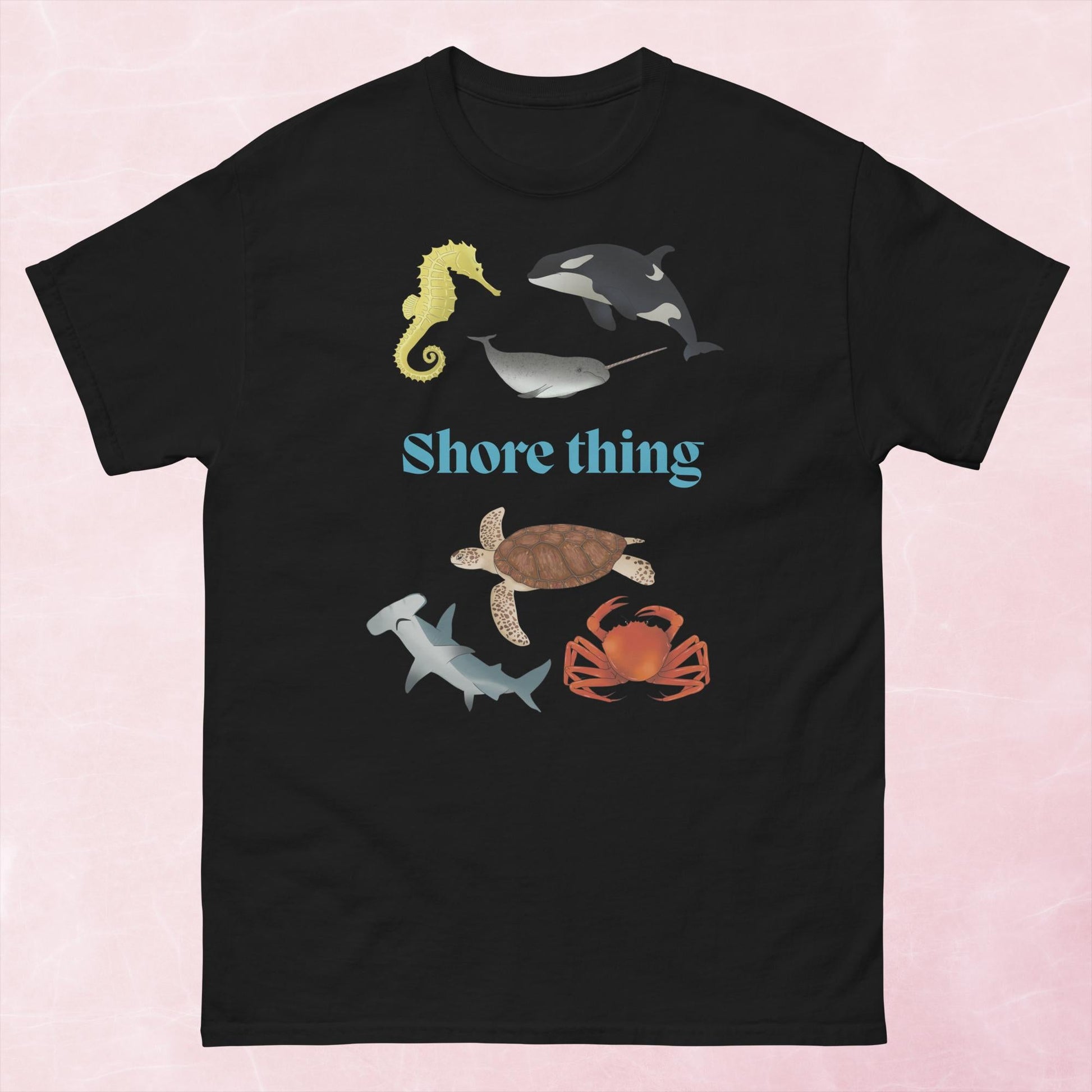 A fun 'shore thing' hand-drawn graphic sea life unisex t-shirt featuring a seahorse, narwhal, orca, green sea turtle, crab and hammerhead shark.