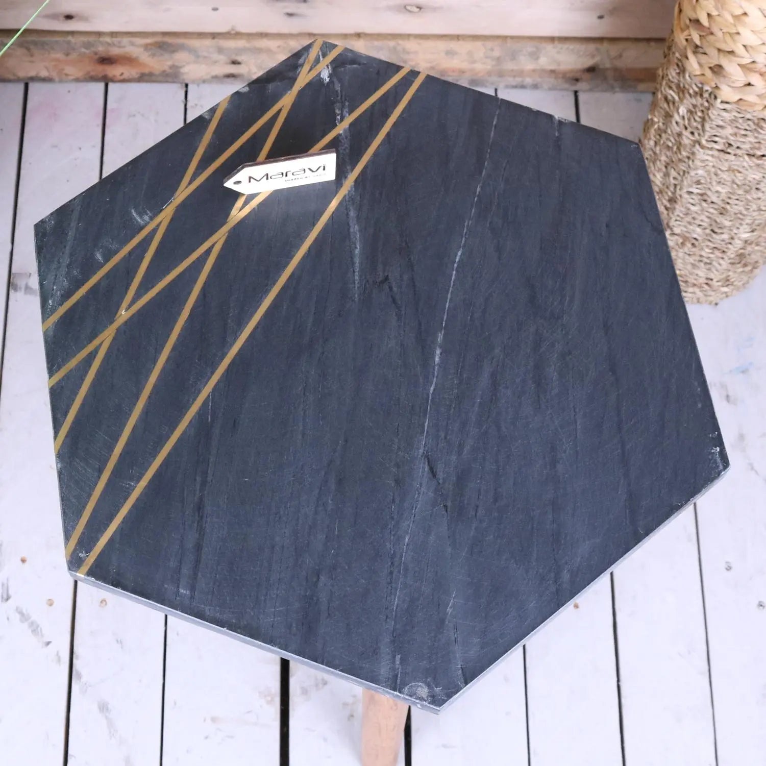 Introducing the Black Marble Side Table, a piece that embodies simplicity and elegance. This hexagon-shaped table is designed to make a statement with its classic and timeless look.