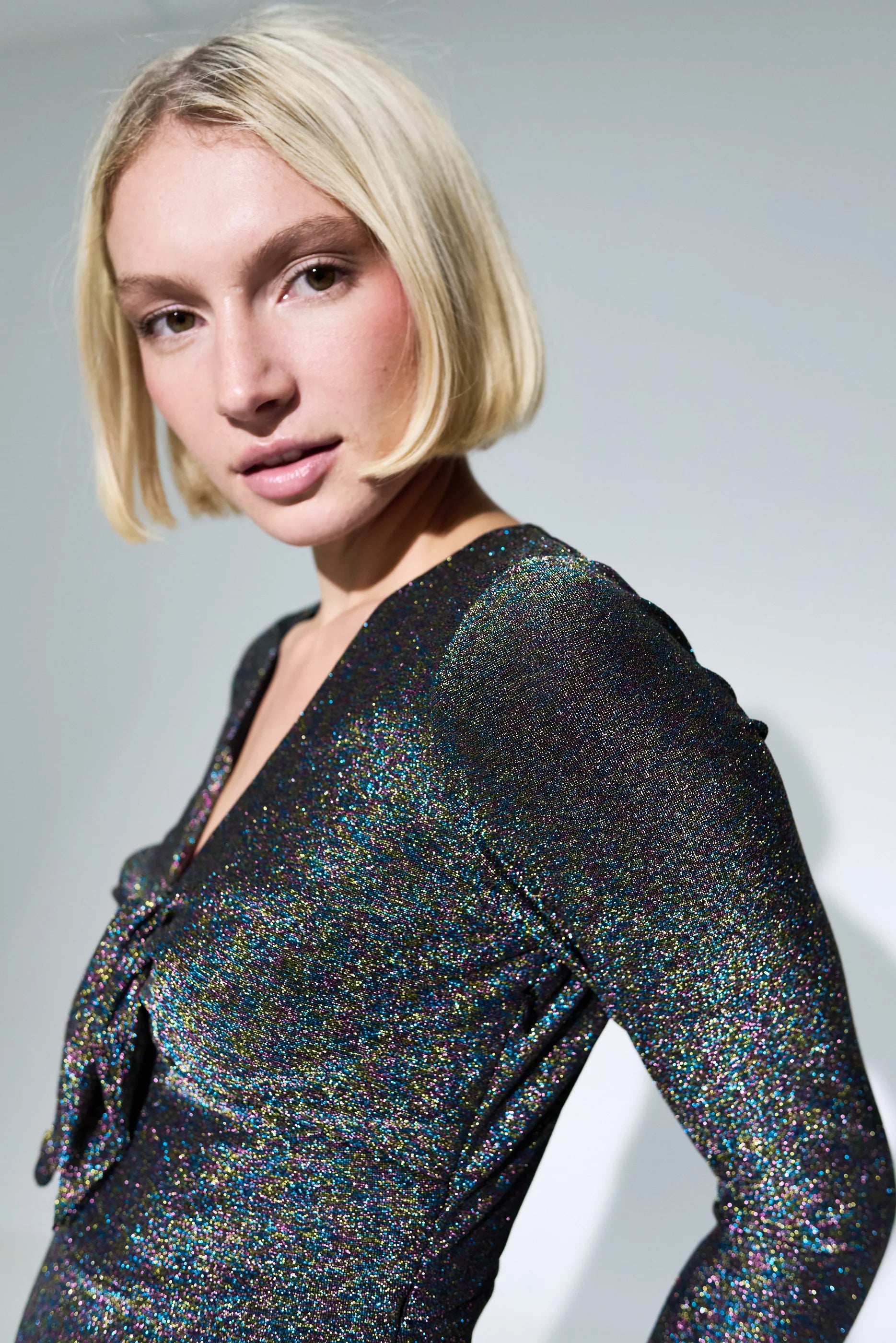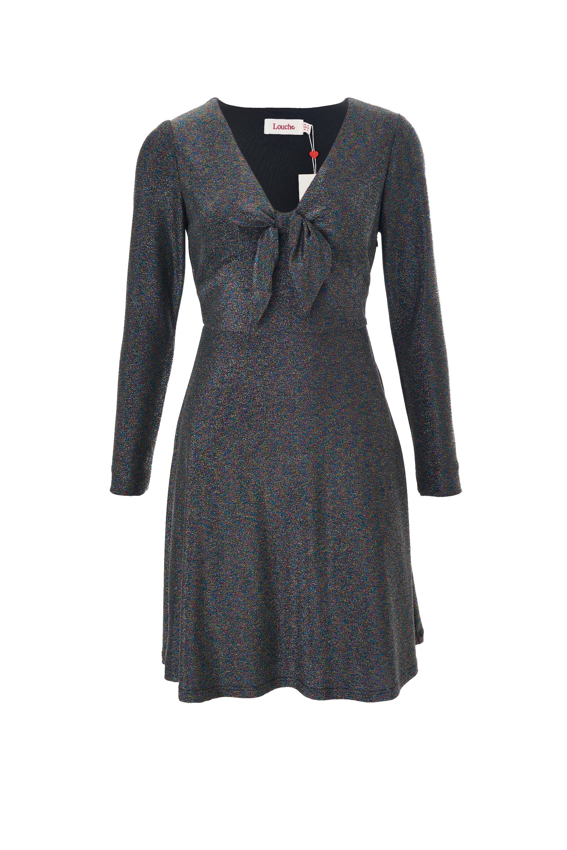 Meet Sidney this oh so cute fit and flare long sleeved short dress with just the subtle shimmer. featuring a flattering V-Neckline tie neckline is party perfect.
