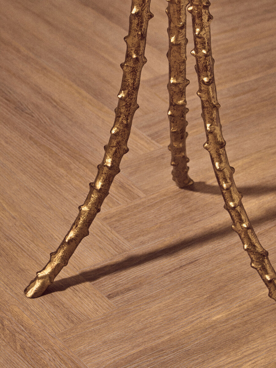 Sika Large Side Table introduces sculptural drama with a nature-inspired twist for Orsina interiors. The Sika Large Side Table stands on a triple-leg base shaped like thorny stems, crafted from iron and finished in warm gold for a luminous highlight.