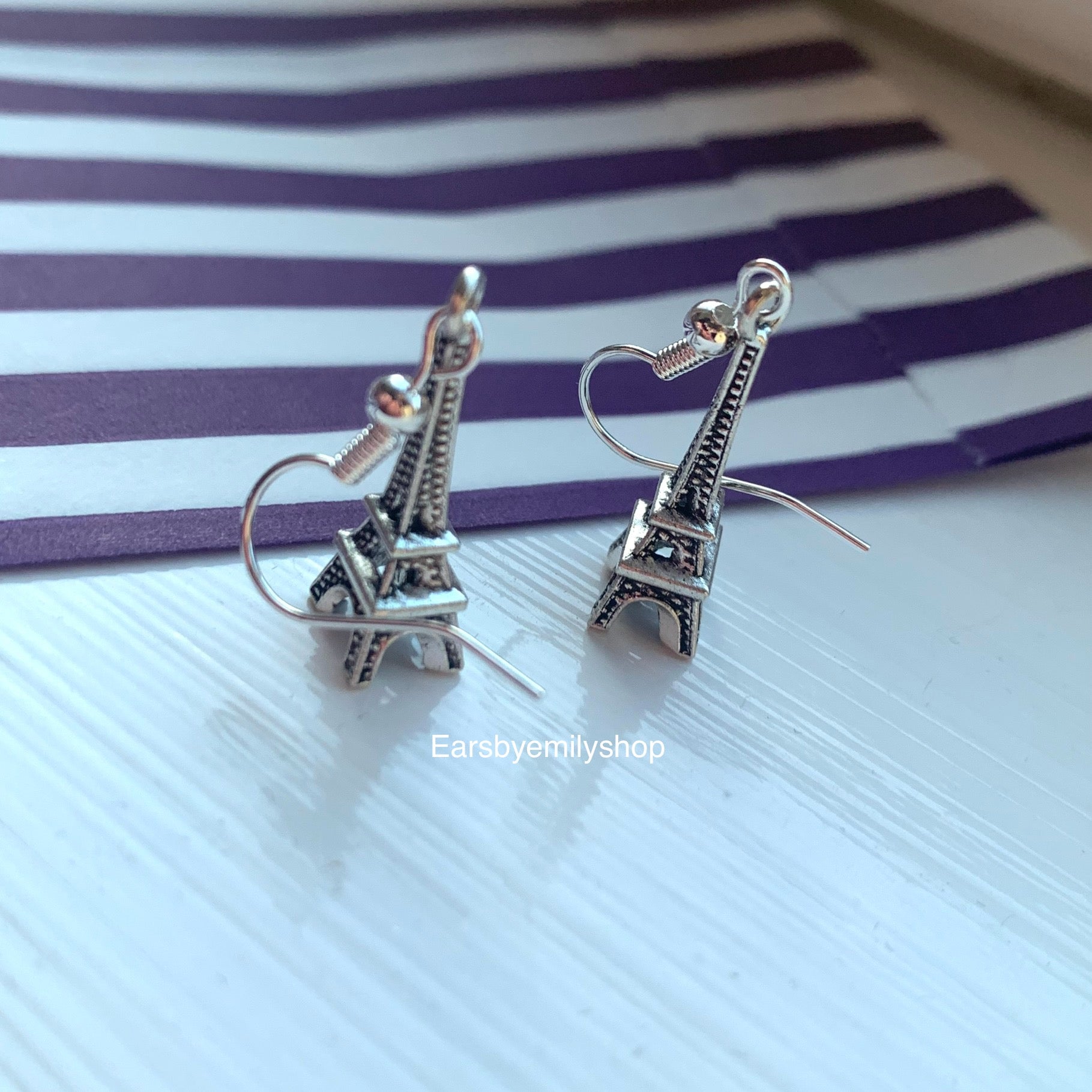 A fun pair of little silver Eiffel Tower earrings on silver plated hooks.