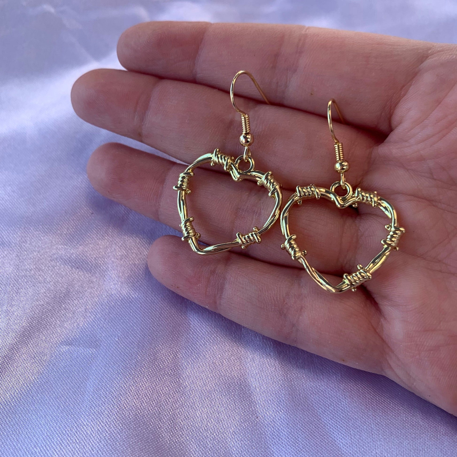 A cool pair of either gold or silver barbwire heart earrings on 18k gold plated or silver plated hooks respectively.