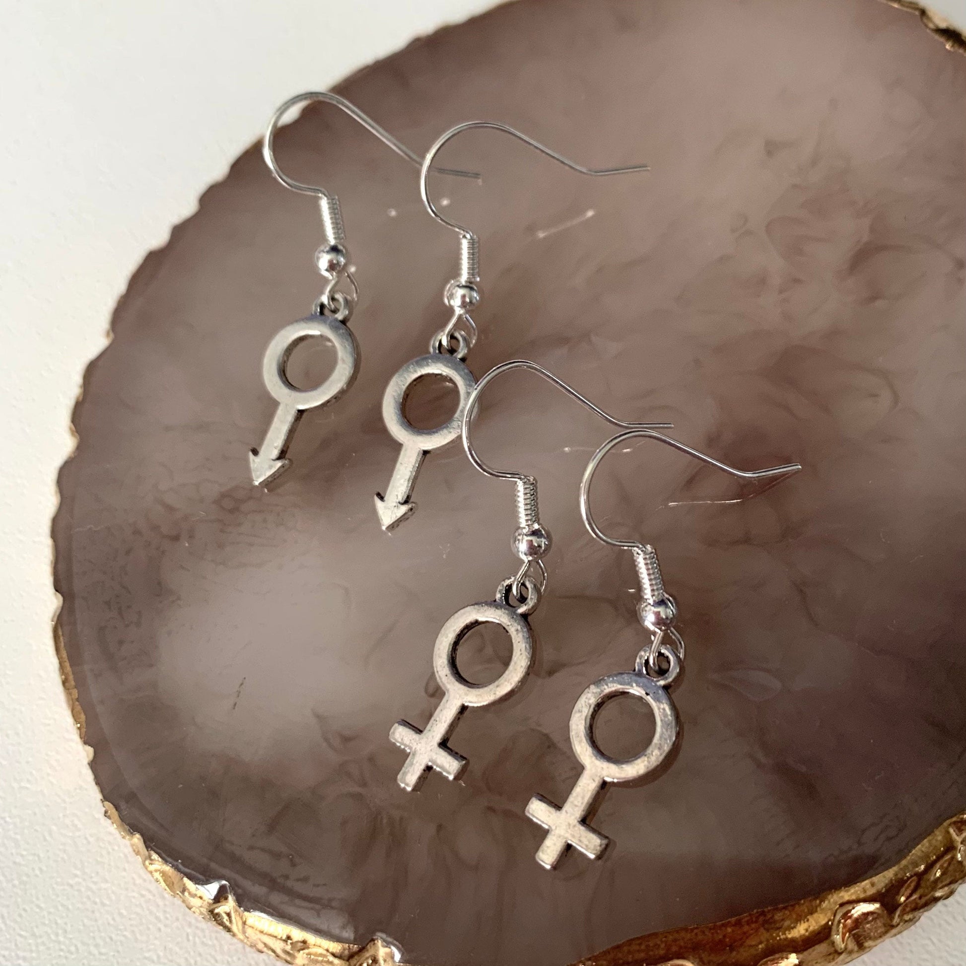 A lovely set of female, male or mixed gender symbol handmade silver plated earrings.