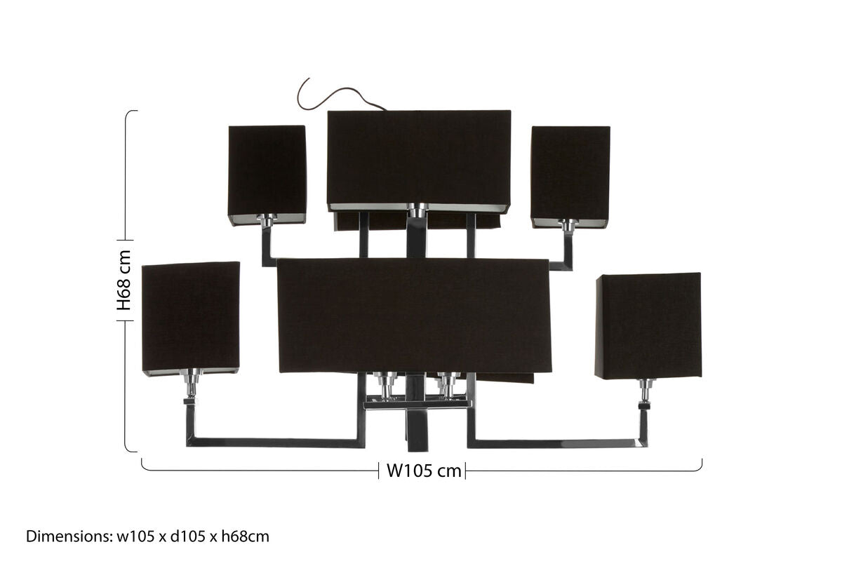 The Skye 12 Bulb Pendant is a study in symmetry and softness. Acrylic shades wrapped in black textured fabric float from silver supports, creating a constellation of twelve light points that read sculptural by day and ambient by night.