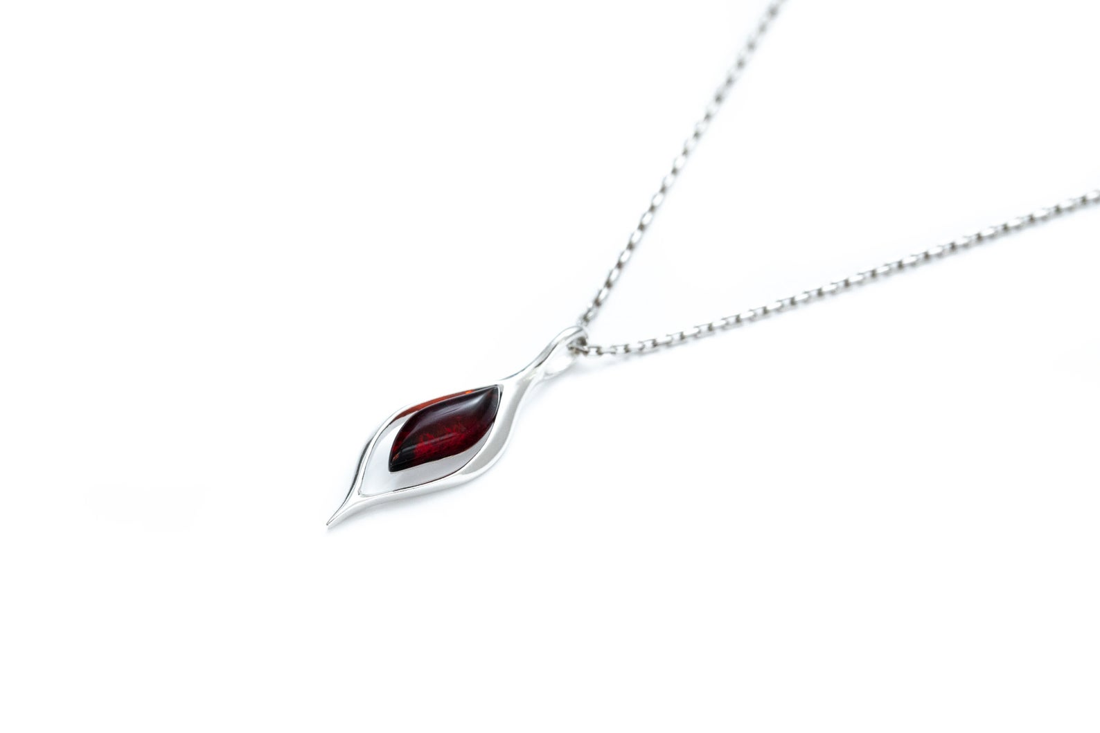 A pendant based on a simplistic and modern design which revolves around the idea of natural curves & shape. The pointed, red amber stone is placed within a small void of negative space surrounded by a delicate, sterling silver design.